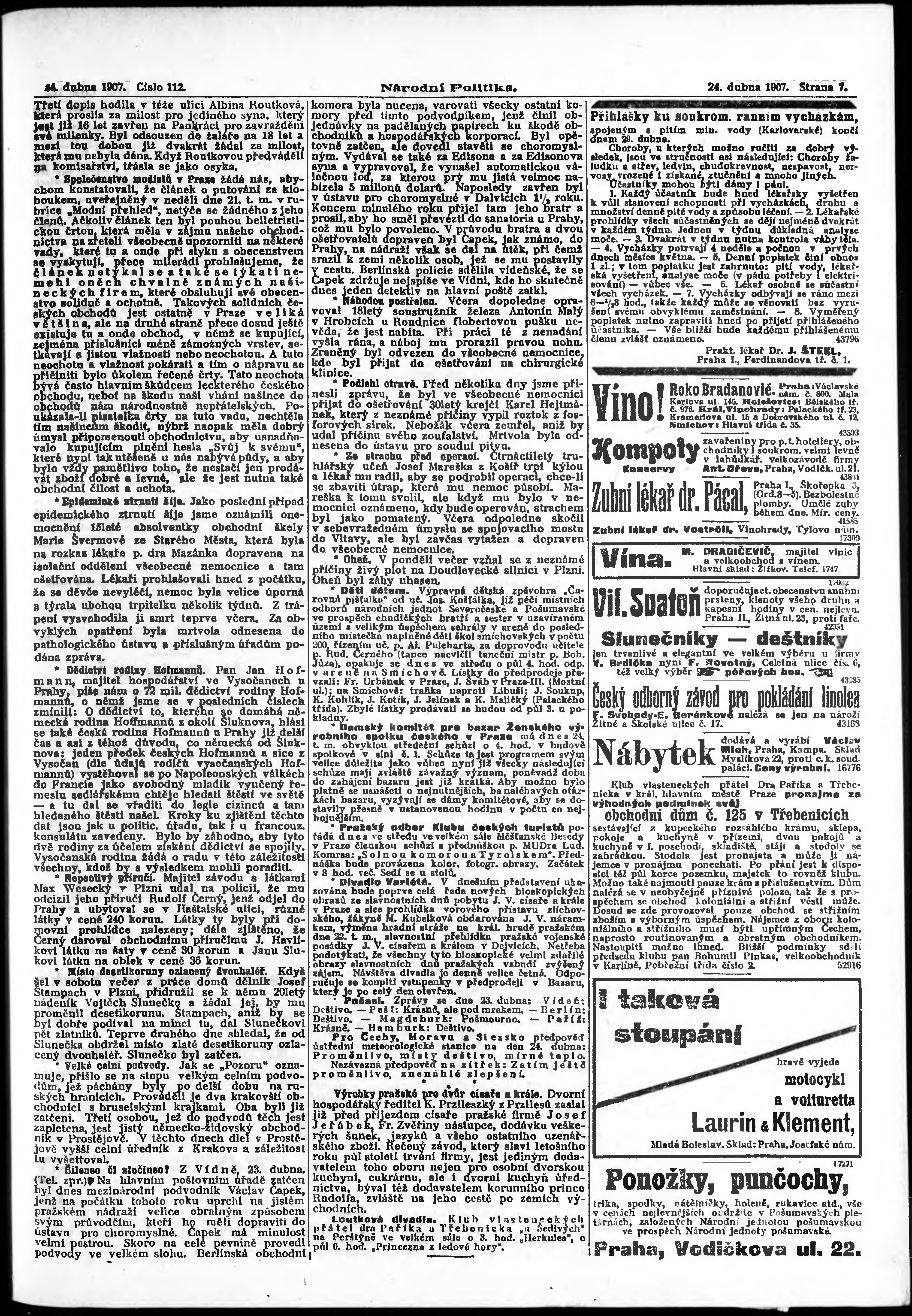 * Datum vydání výtisku: 24.4.1907 Číslo výtisku: 112 Poznámky k výtisku: ranní vydání;