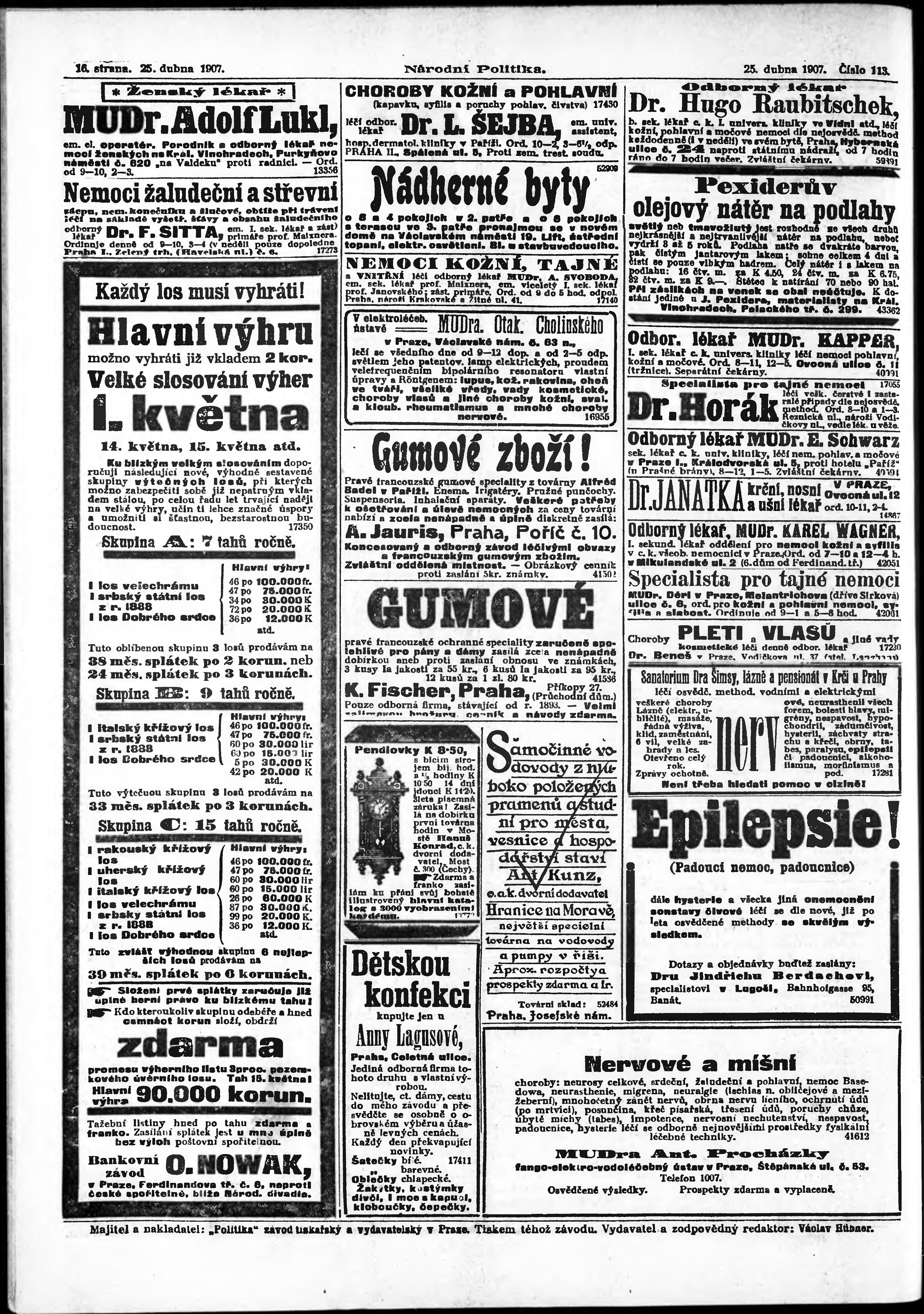 * Datum vydání výtisku: 25.4.1907 Číslo výtisku: 113 Poznámky k výtisku: ranní vydání;