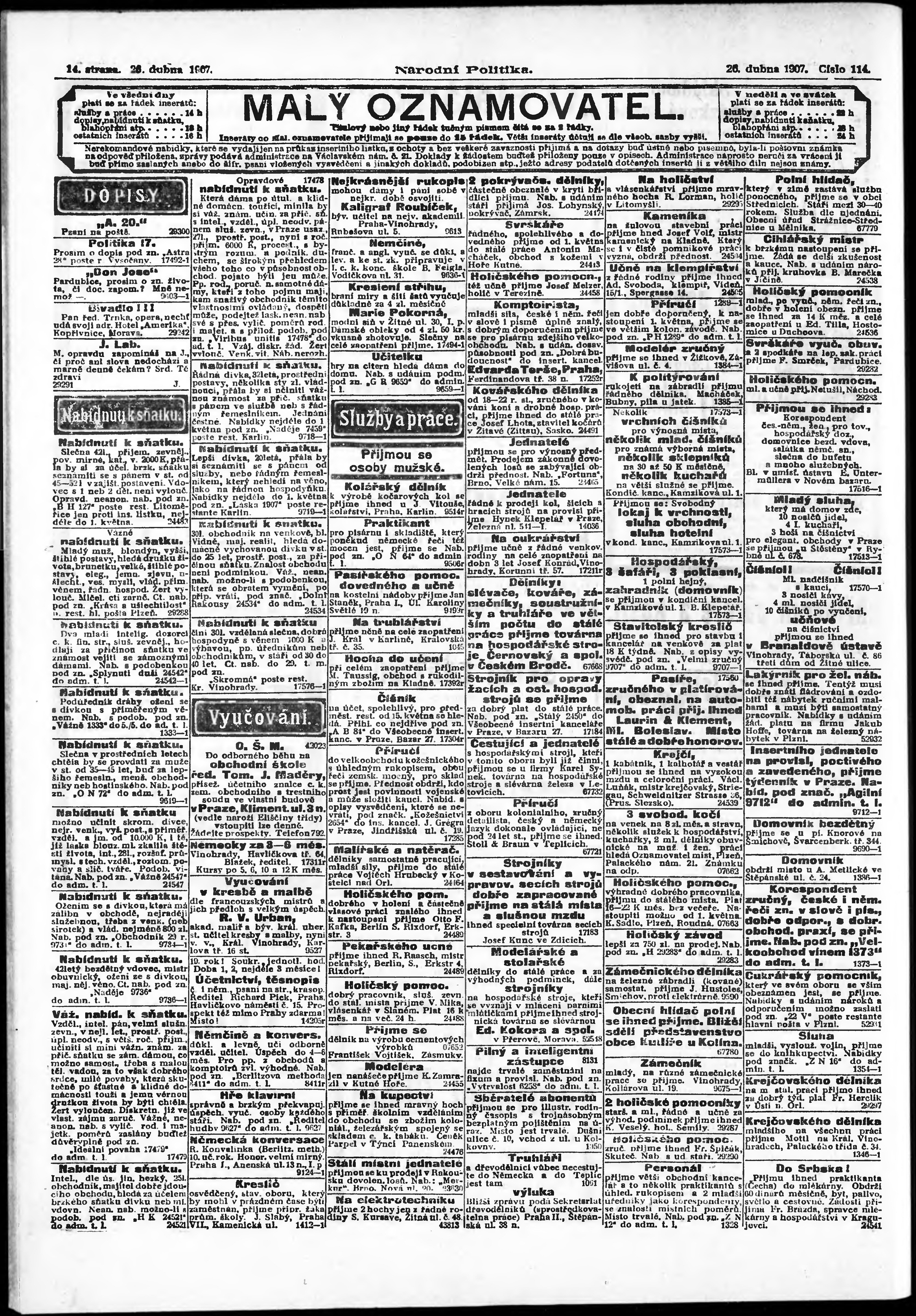 * Datum vydání výtisku: 26.4.1907 Číslo výtisku: 114 Poznámky k výtisku: ranní vydání;