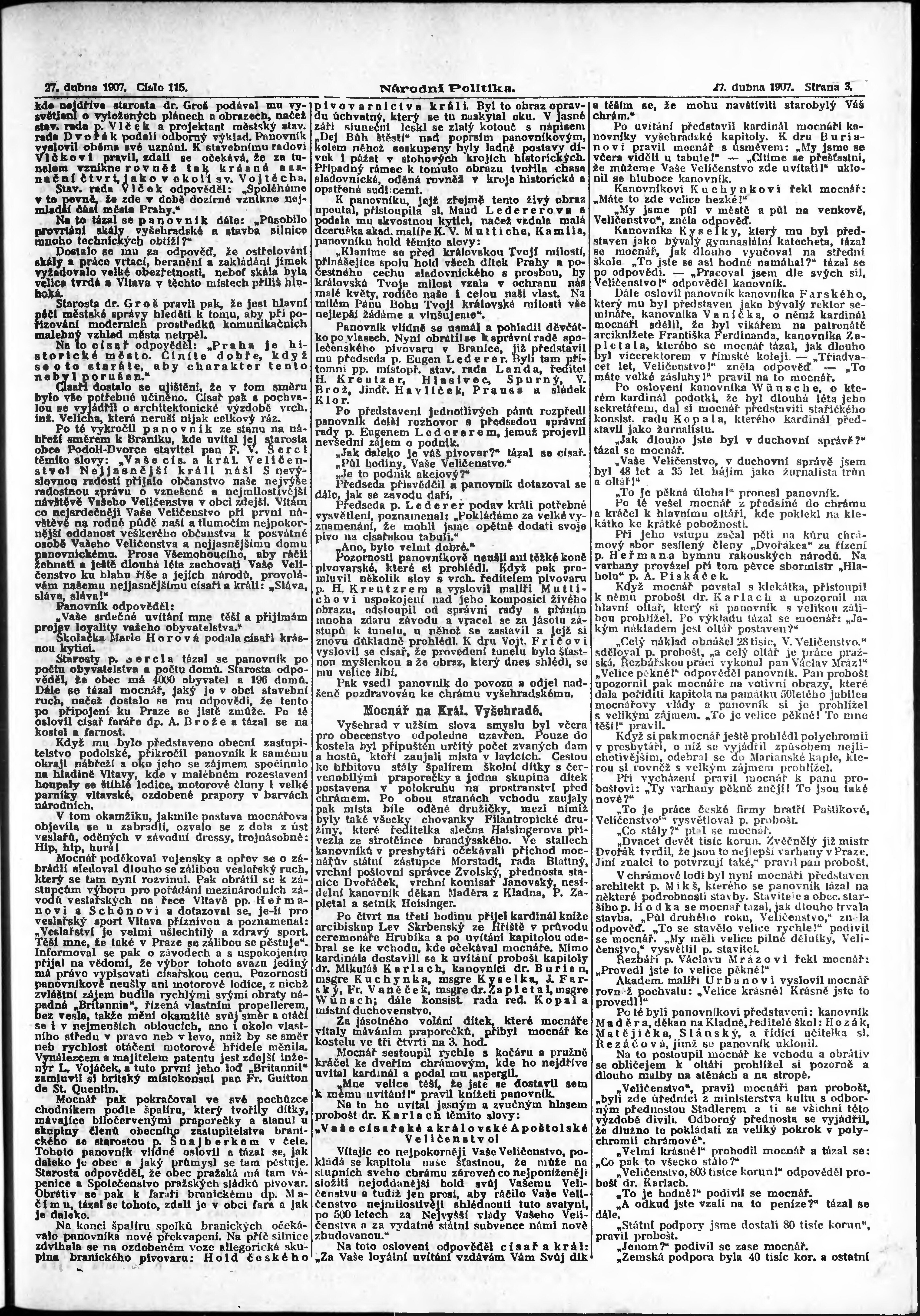 * Datum vydání výtisku: 27.4.1907 Číslo výtisku: 115 Poznámky k výtisku: ranní vydání;