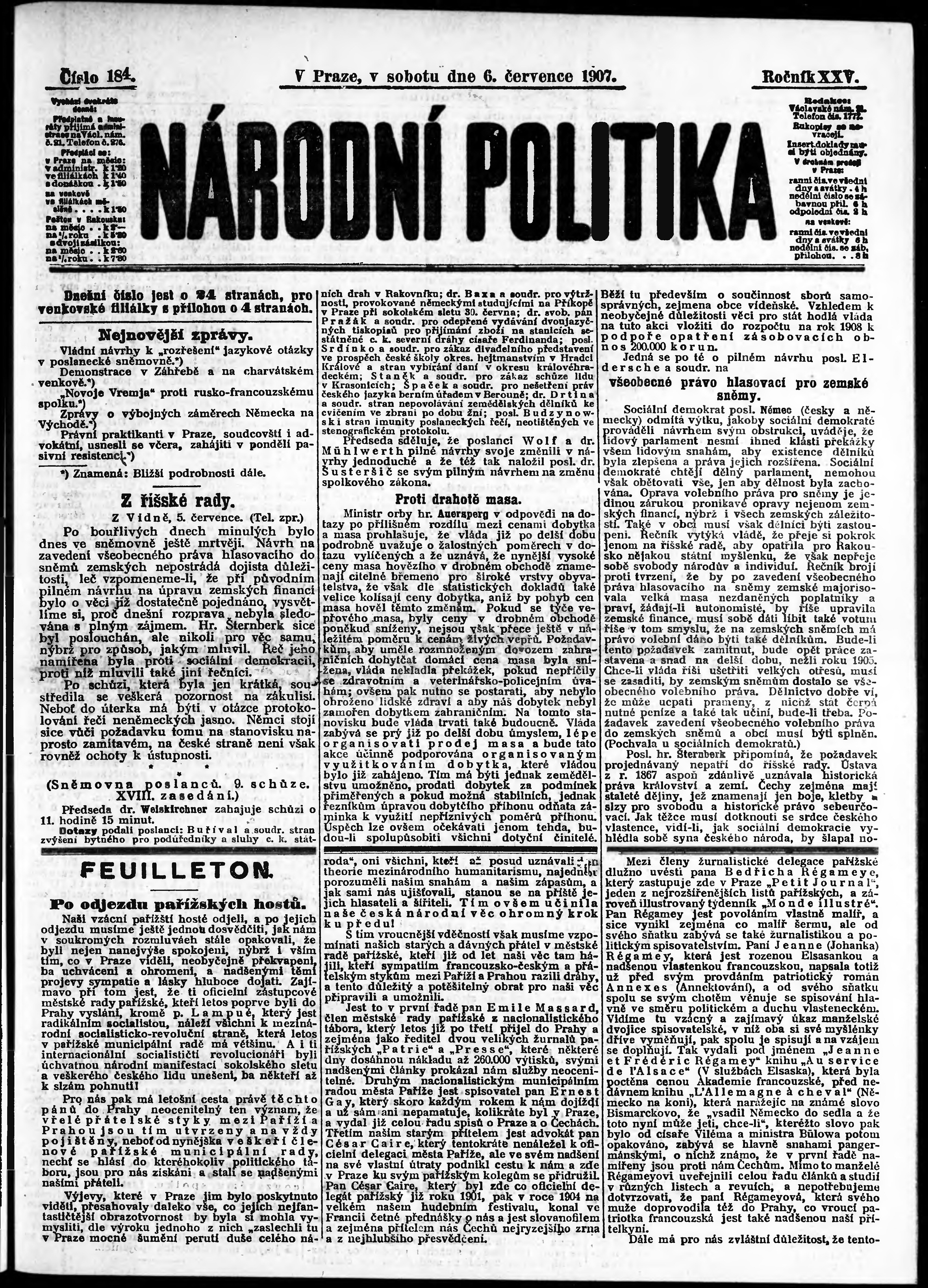 * Datum vydání výtisku: 6.7.1907 Číslo výtisku: 184 Poznámky k výtisku: ranní vydání;