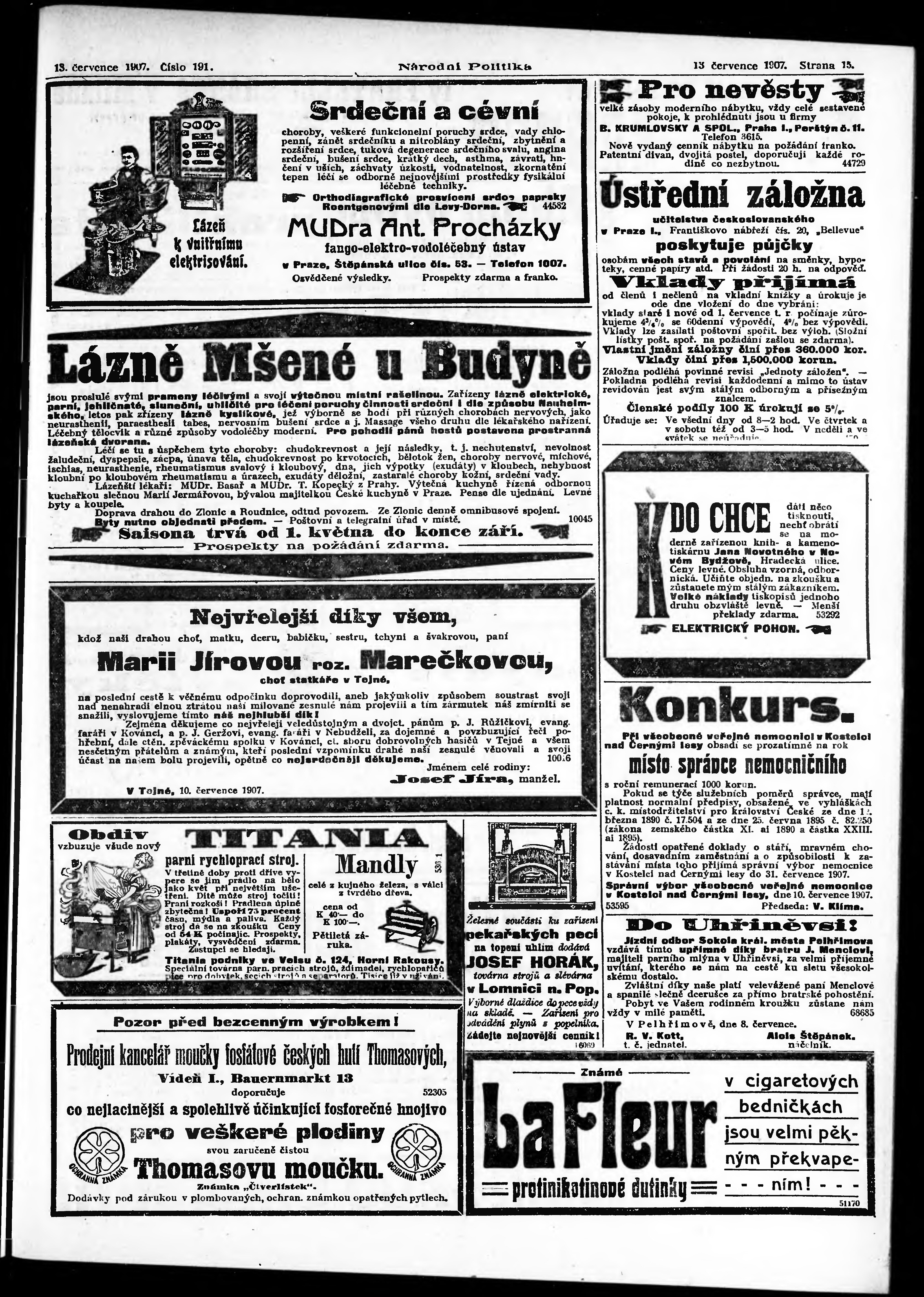 * Datum vydání výtisku: 13.7.1907 Číslo výtisku: 191 Poznámky k výtisku: ranní vydání;