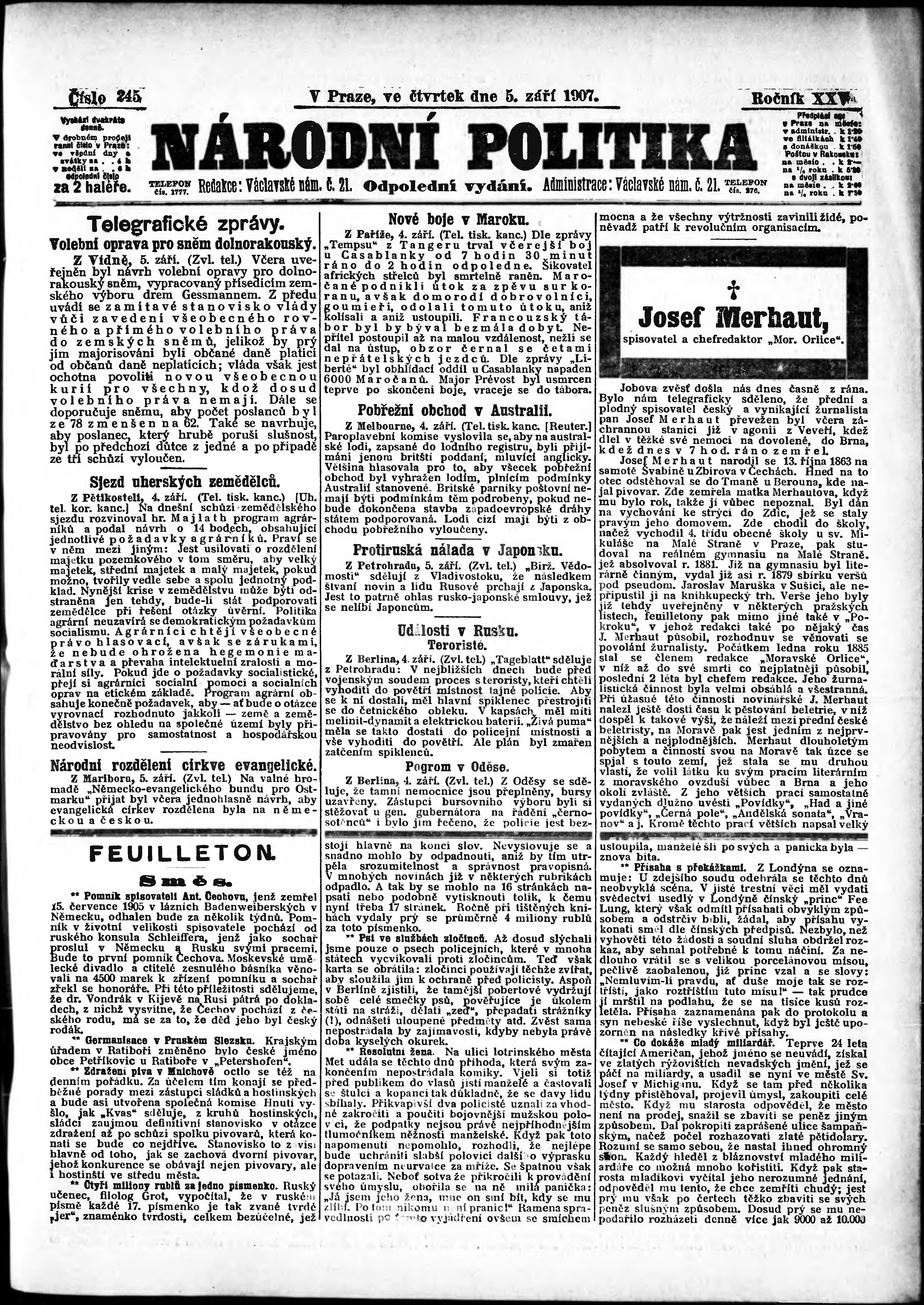 * Datum vydání výtisku: 5.9.1907 Číslo výtisku: 245 Poznámky k výtisku: odpolední vydání;