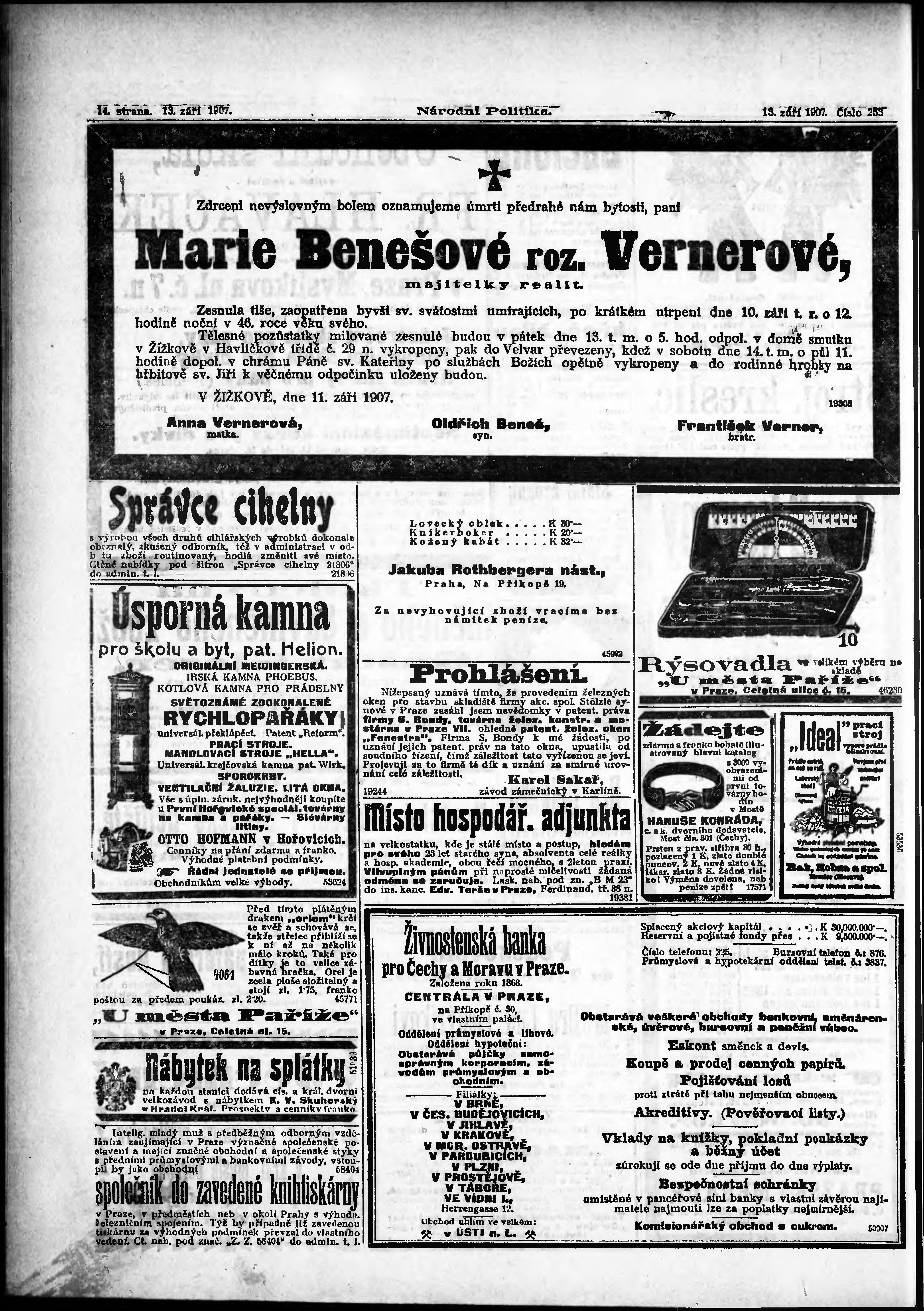 * Datum vydání výtisku: 13.9.1907 Číslo výtisku: 253 Poznámky k výtisku: ranní vydání;