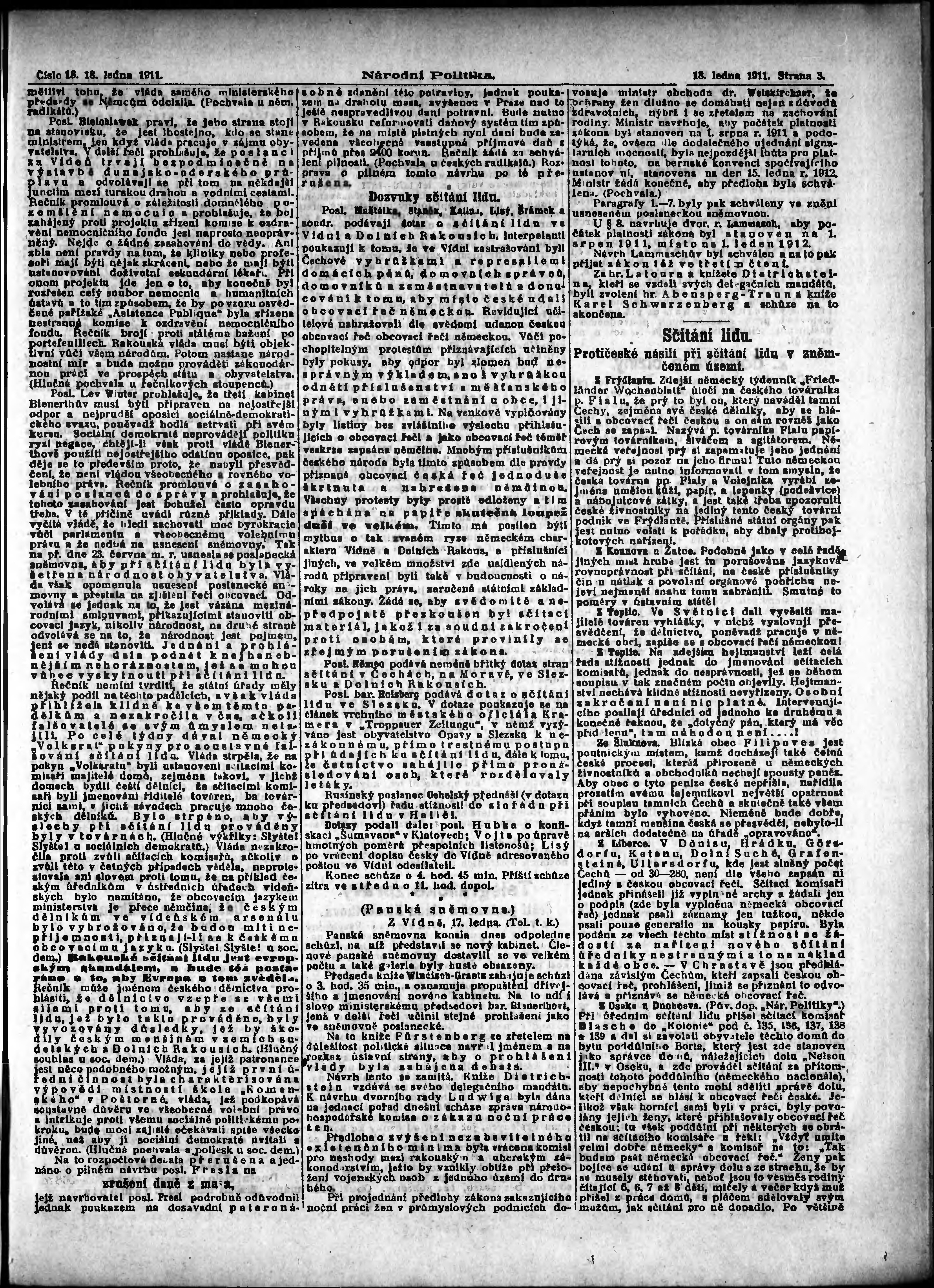 * Datum vydání výtisku: 18.1.1911 Číslo výtisku: 18 Poznámky k výtisku: ranní vydání; s. 11 - 12 není k dispozici;