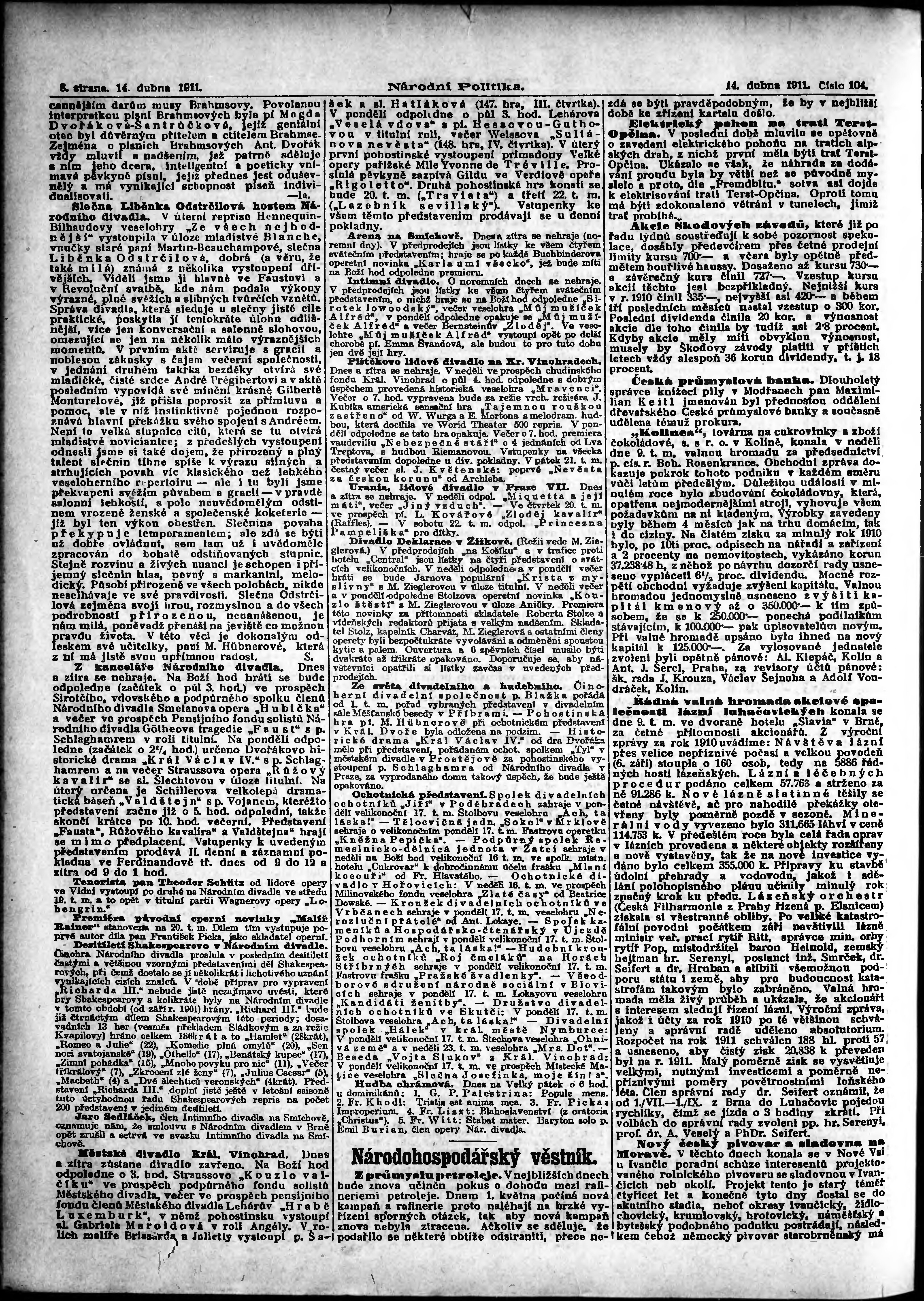 * Datum vydání výtisku: 14.4.1911 Číslo výtisku: 104 Poznámky k výtisku: ranní vydání;