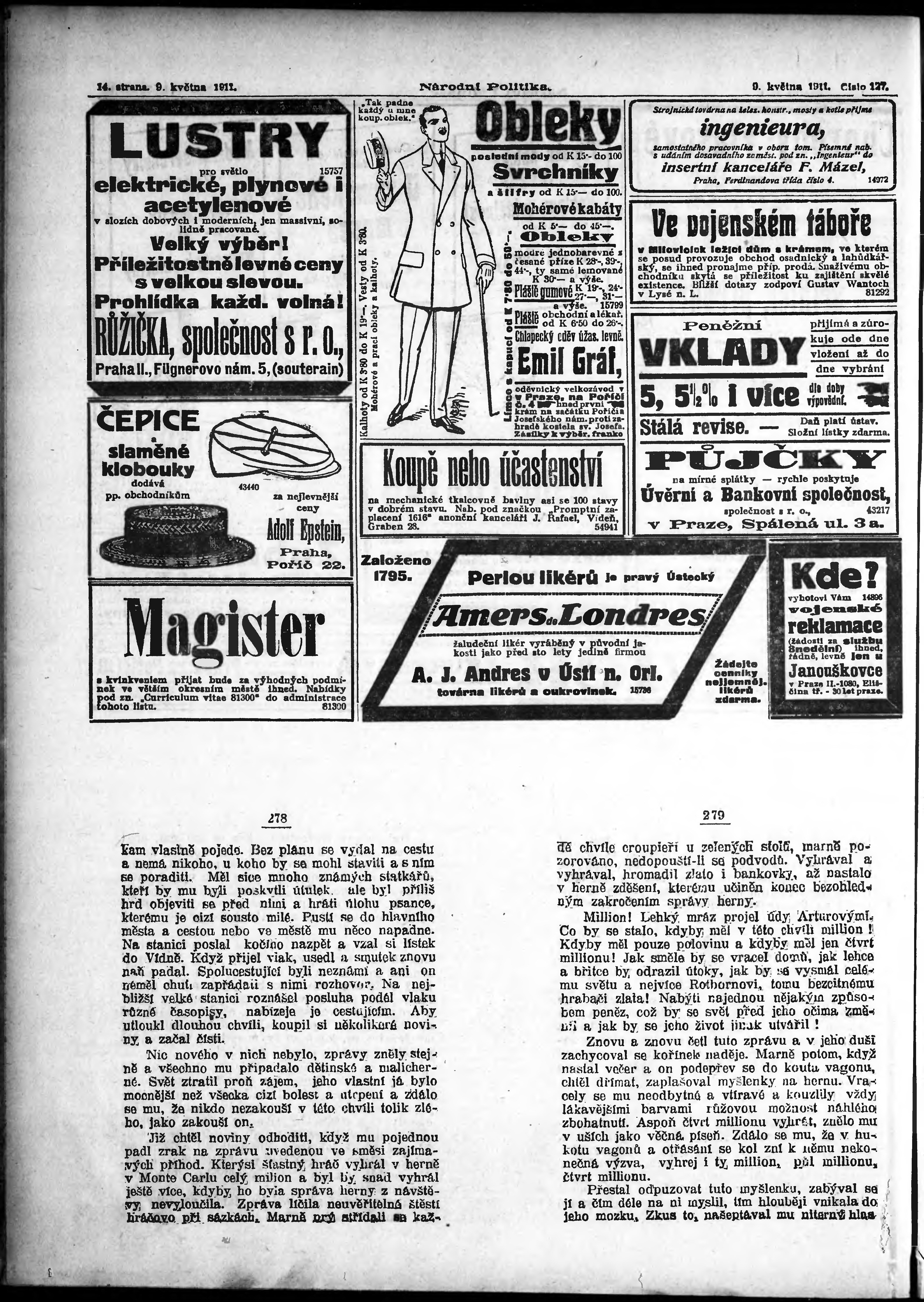 * Datum vydání výtisku: 9.5.1911 Číslo výtisku: 127 Poznámky k výtisku: ranní vydání; s. 11 - 12 není k dispozici;