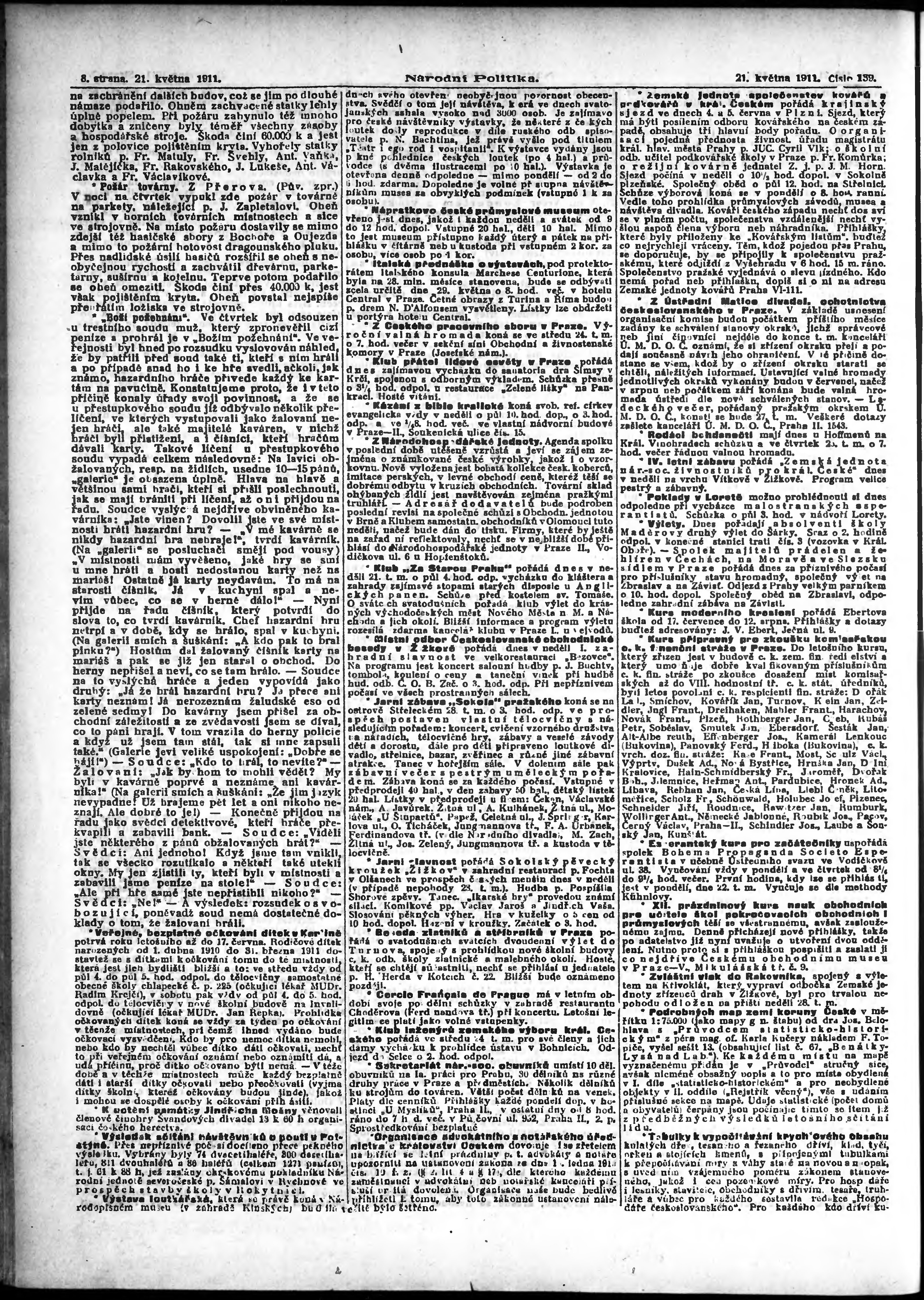* Datum vydání výtisku: 21.5.1911 Číslo výtisku: 139 Poznámky k výtisku: ranní vydání;