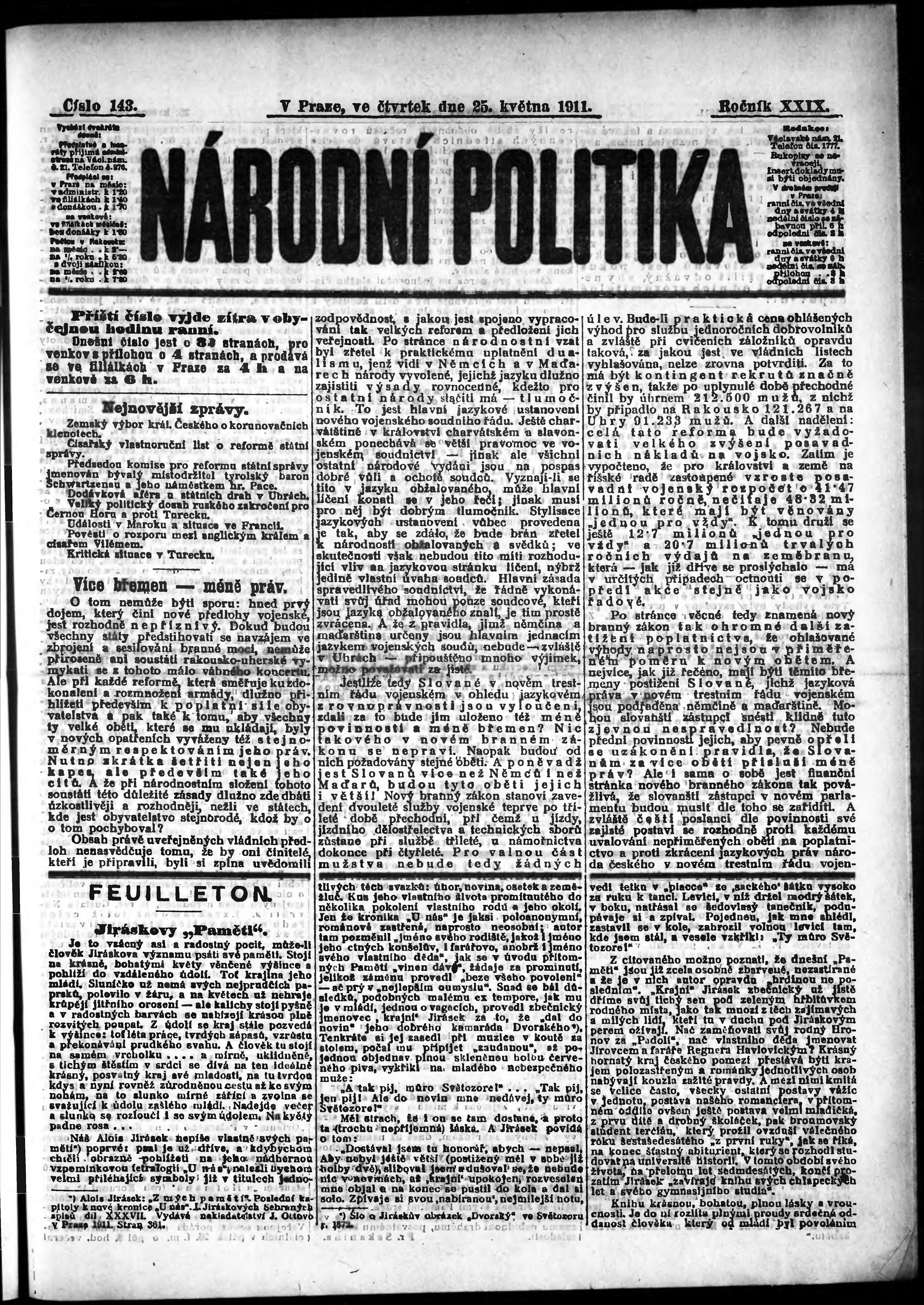 * Datum vydání výtisku: 25.5.1911 Číslo výtisku: 143 Poznámky k výtisku: ranní vydání;