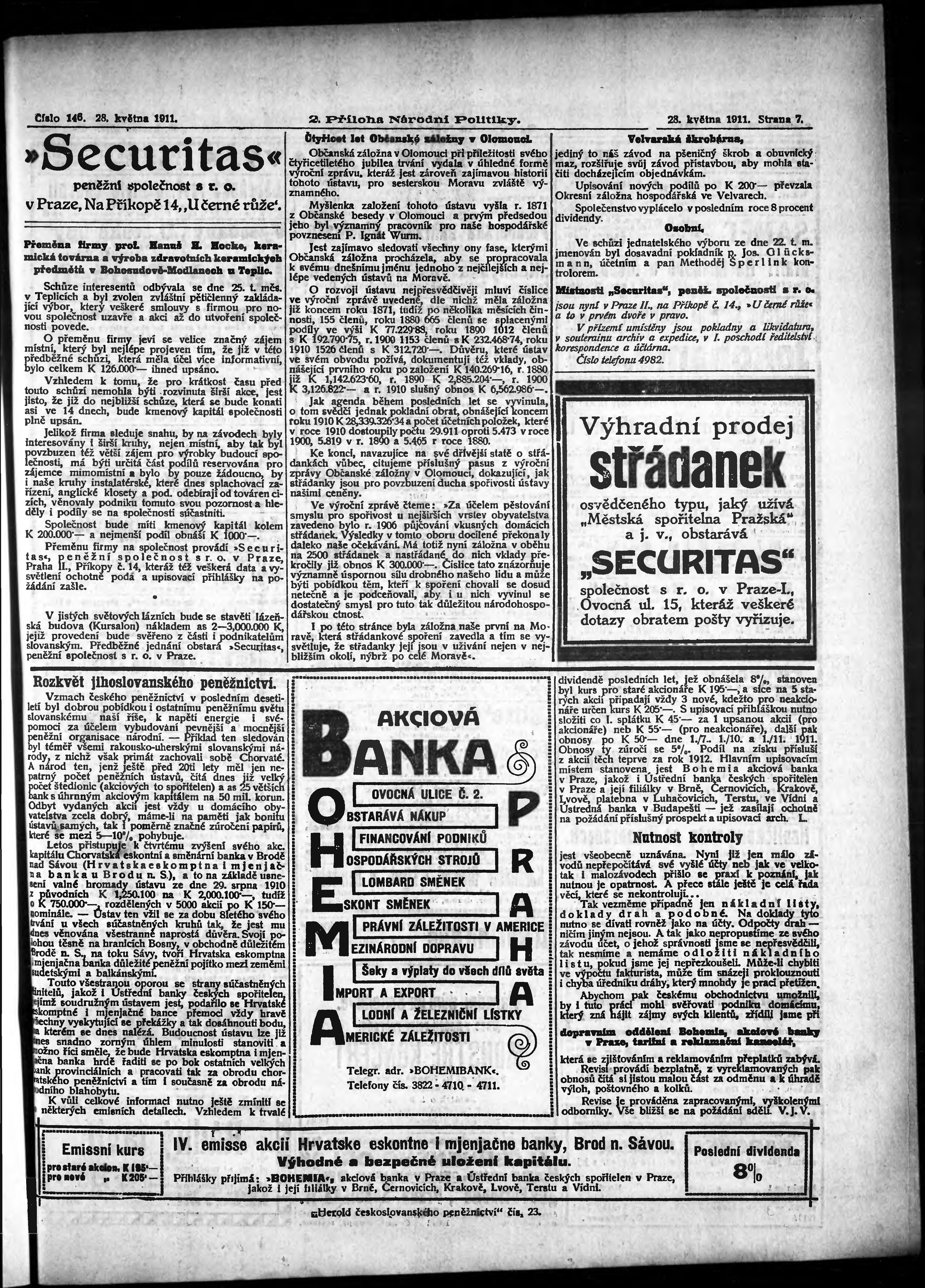* Datum vydání výtisku: 28.5.1911 Číslo výtisku: 146 Typ výtisku: příloha Poznámky k výtisku: 2. příloha; obsahuje č. 23 Herold českoslovanského peněžnictví;