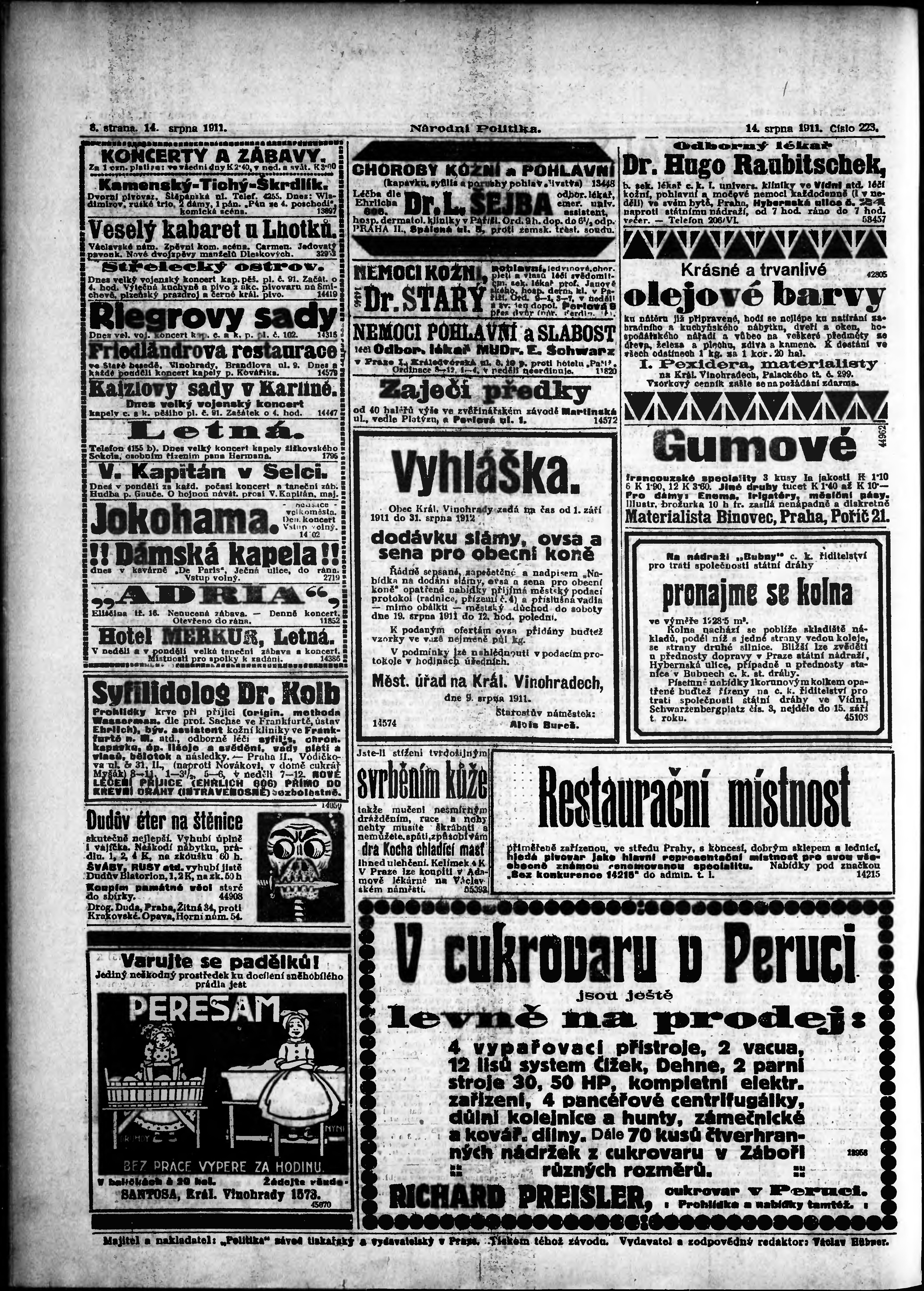 * Datum vydání výtisku: 14.8.1911 Číslo výtisku: 223 Poznámky k výtisku: ranní vydání;