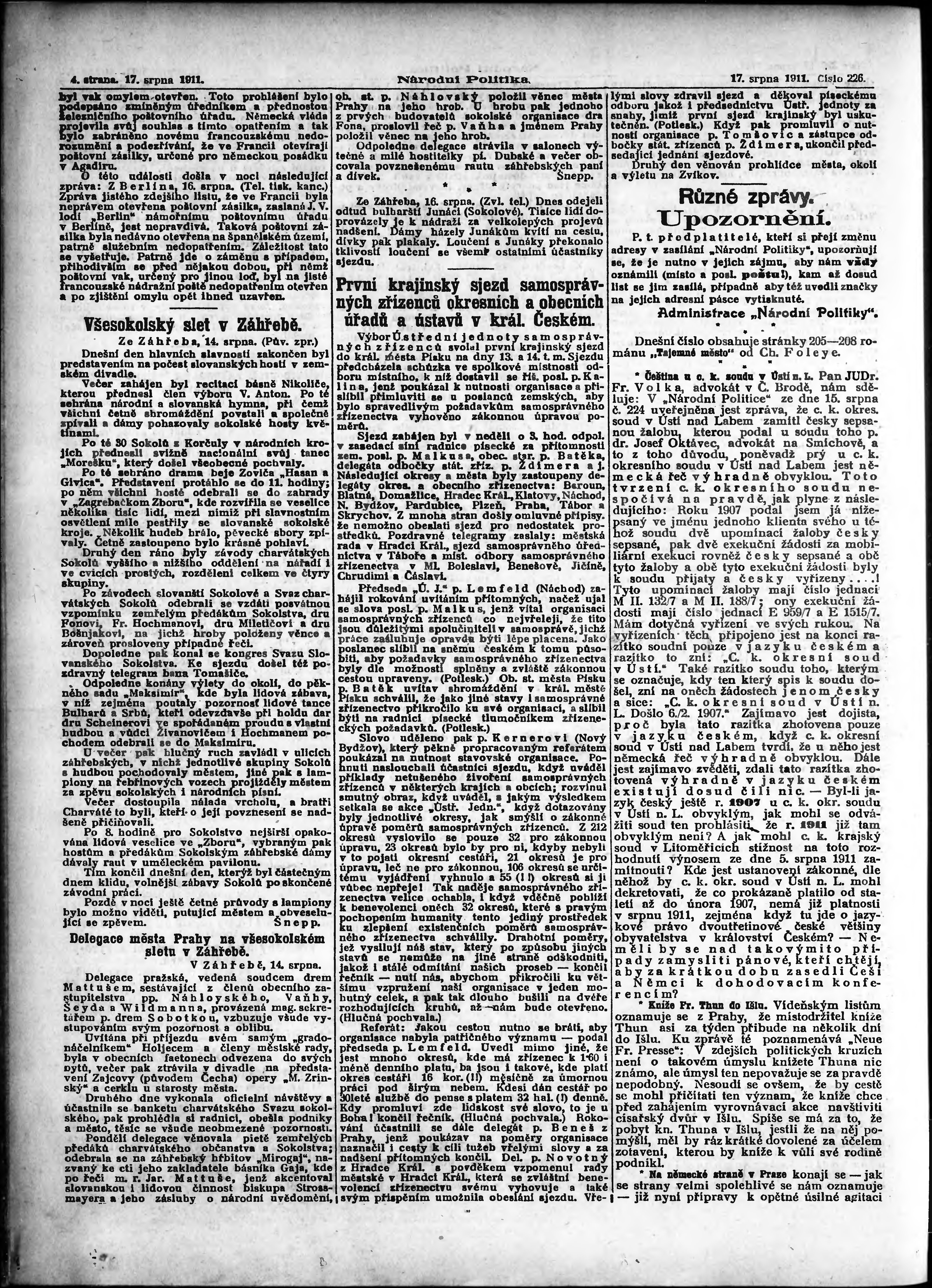 * Datum vydání výtisku: 17.8.1911 Číslo výtisku: 226 Poznámky k výtisku: ranní vydání; s. 11 - 12 není k dispozici;
