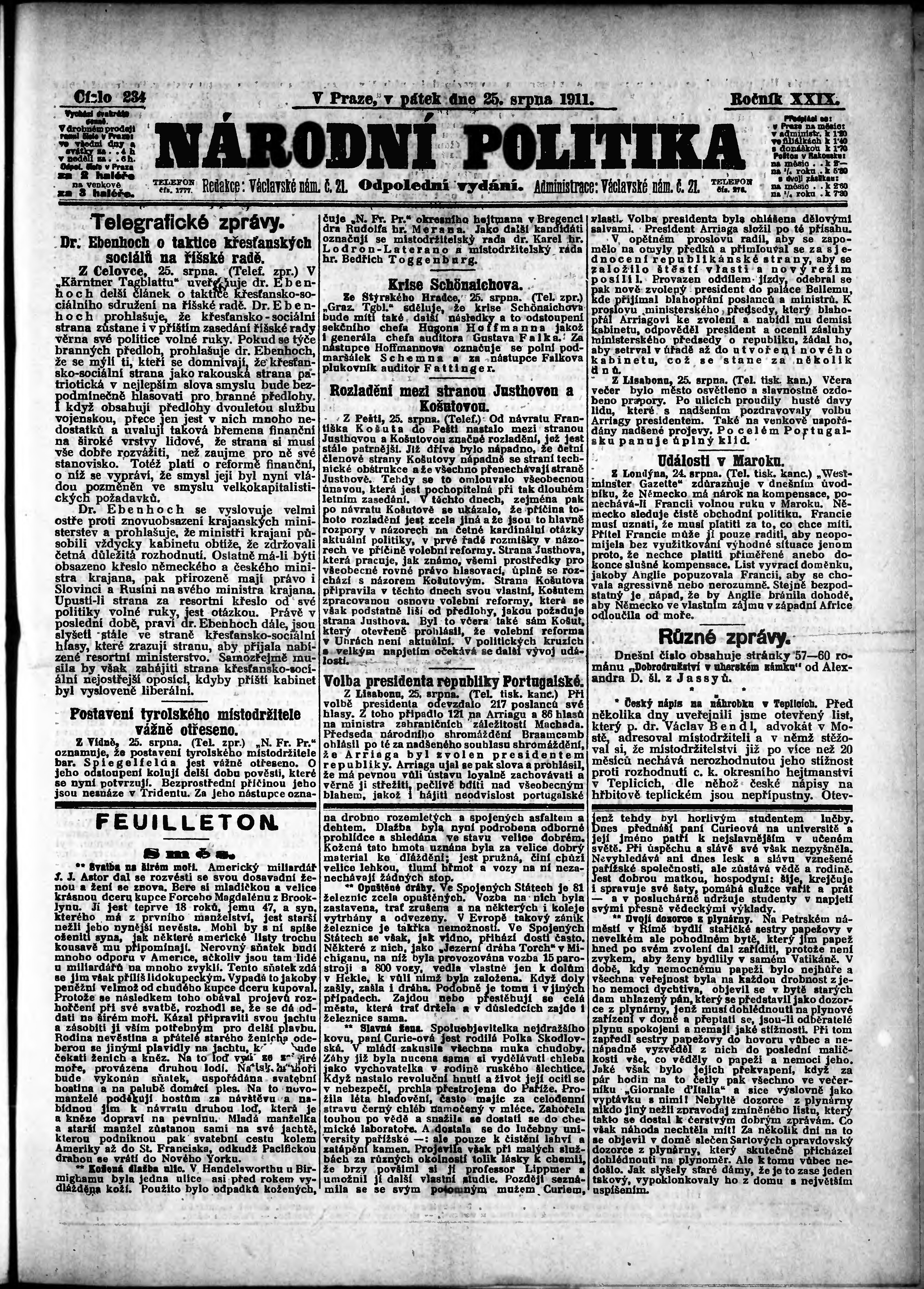 * Datum vydání výtisku: 25.8.1911 Číslo výtisku: 234 Poznámky k výtisku: odpolední vydání;