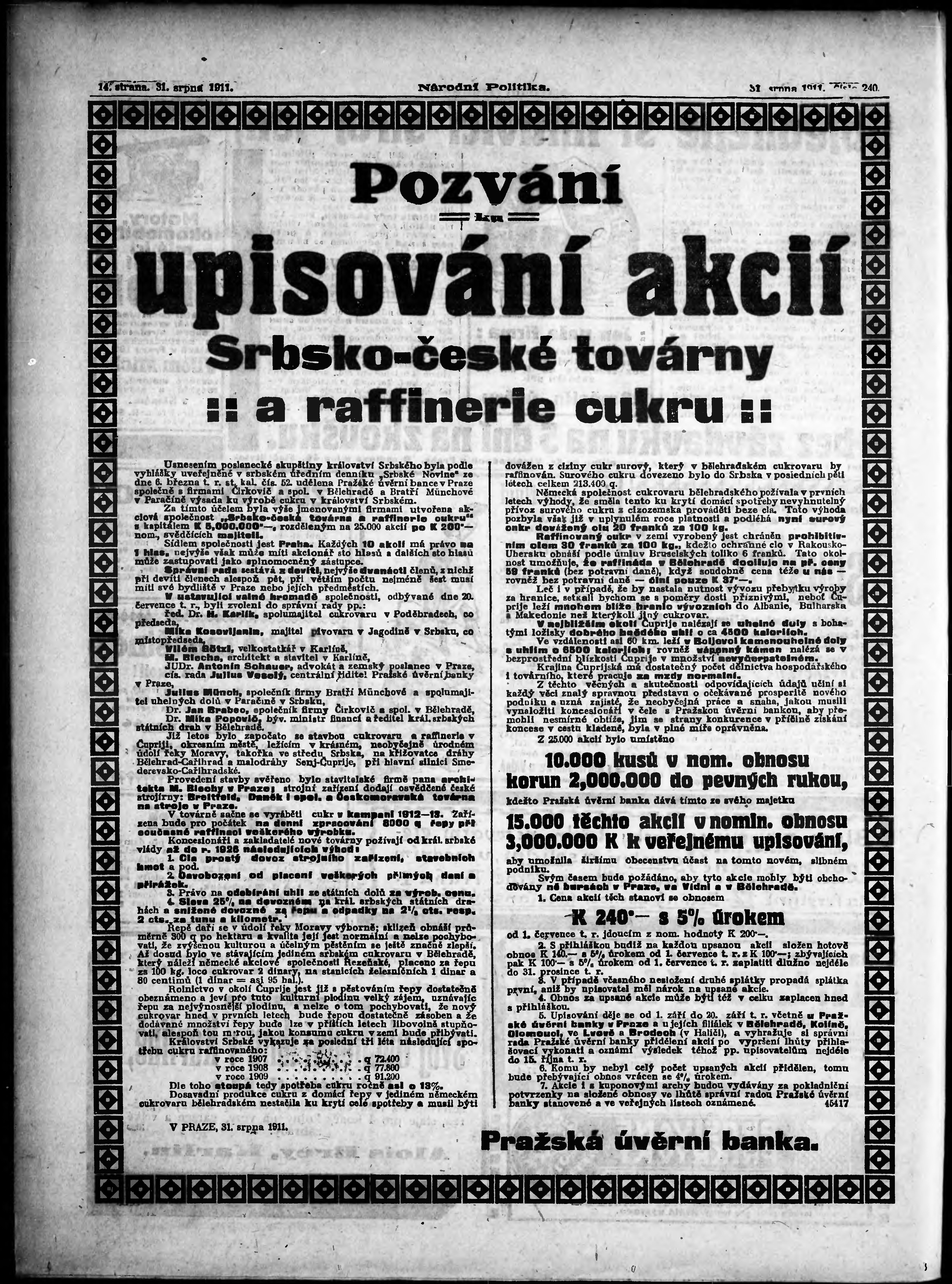 * Datum vydání výtisku: 31.8.1911 Číslo výtisku: 240 Poznámky k výtisku: ranní vydání;