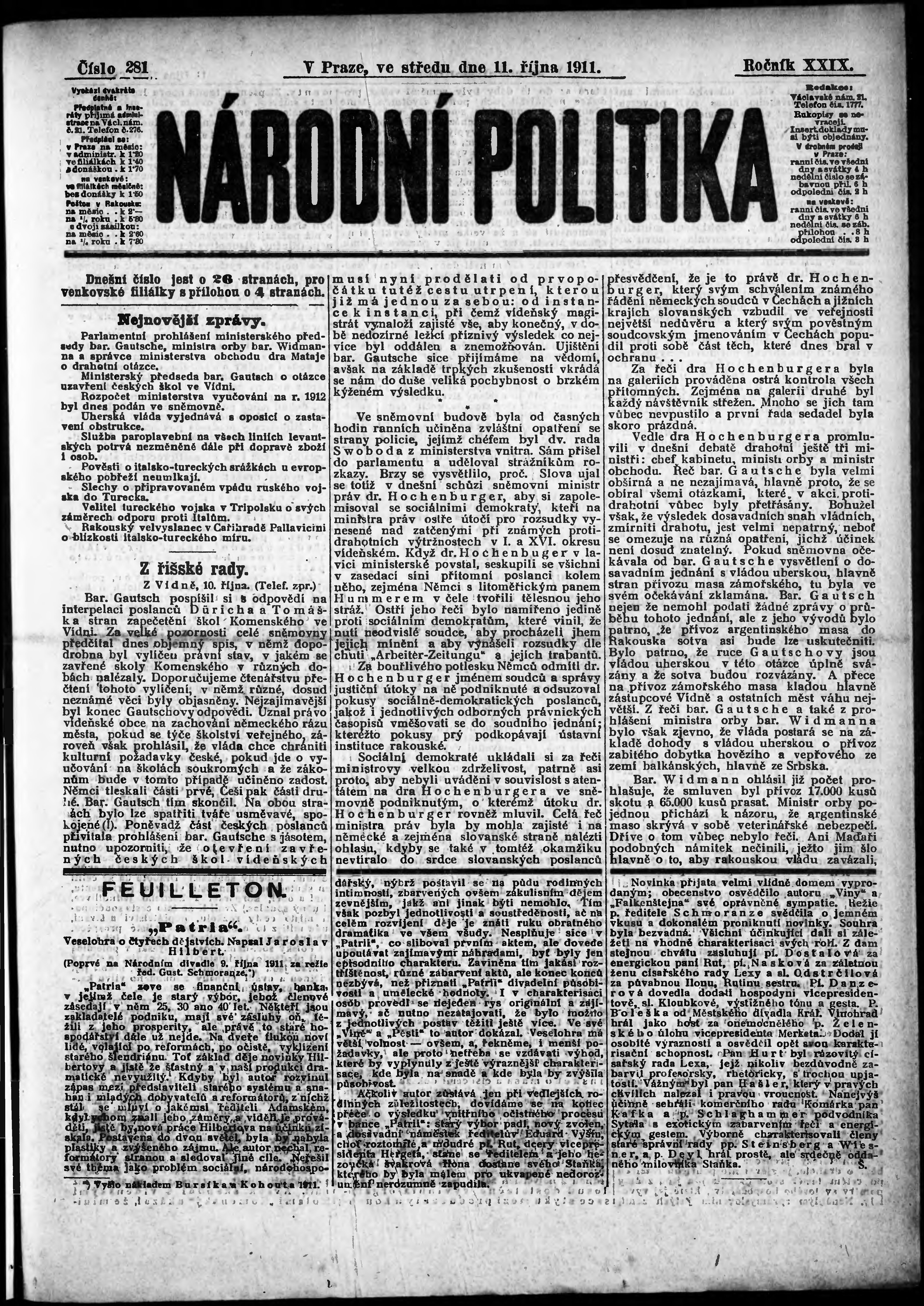 * Datum vydání výtisku: 11.10.1911 Číslo výtisku: 281 Poznámky k výtisku: ranní vydání; s. 9 - 10 není k dispozici;