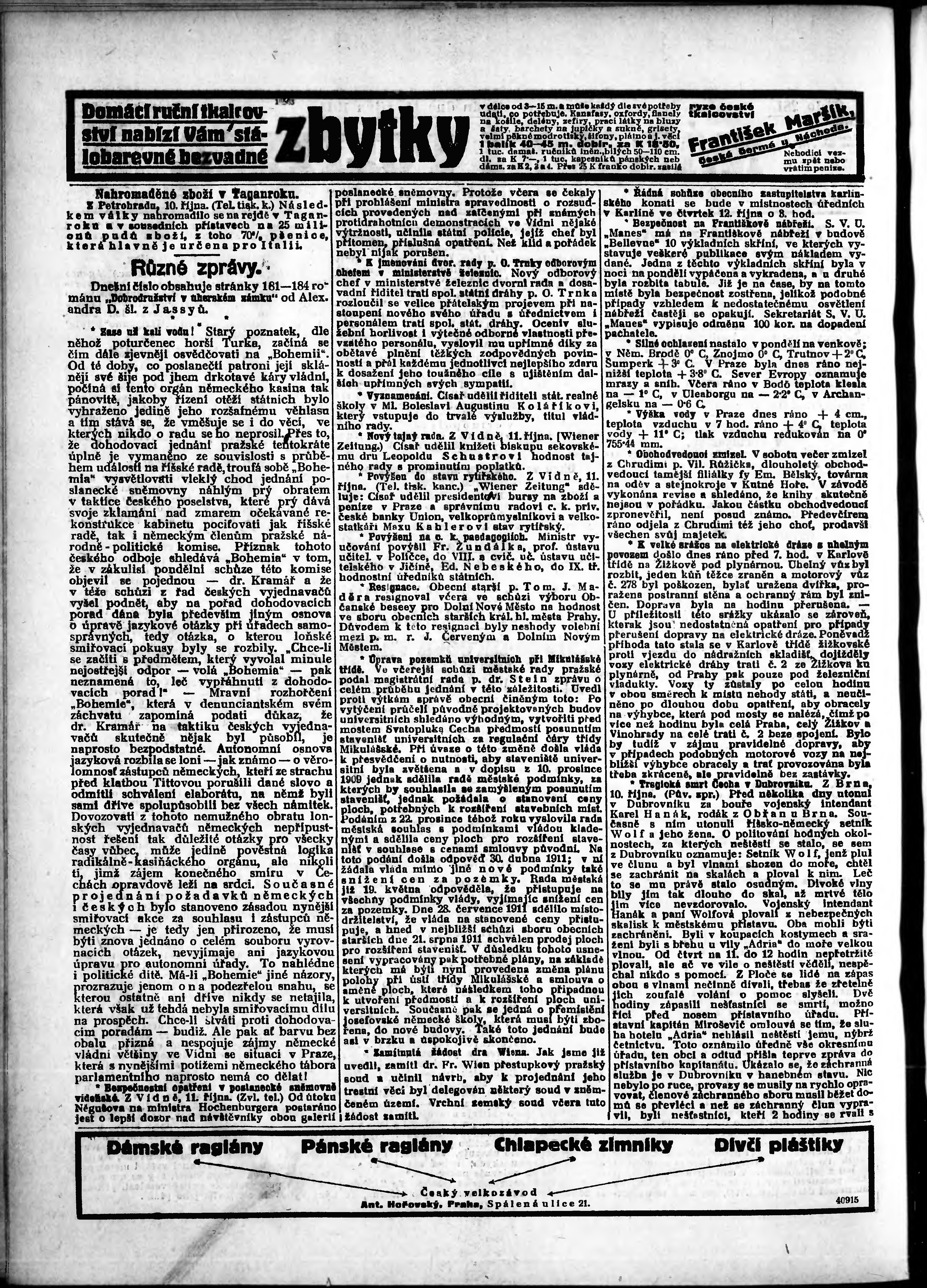 * Datum vydání výtisku: 11.10.1911 Číslo výtisku: 281 Poznámky k výtisku: odpolední vydání;