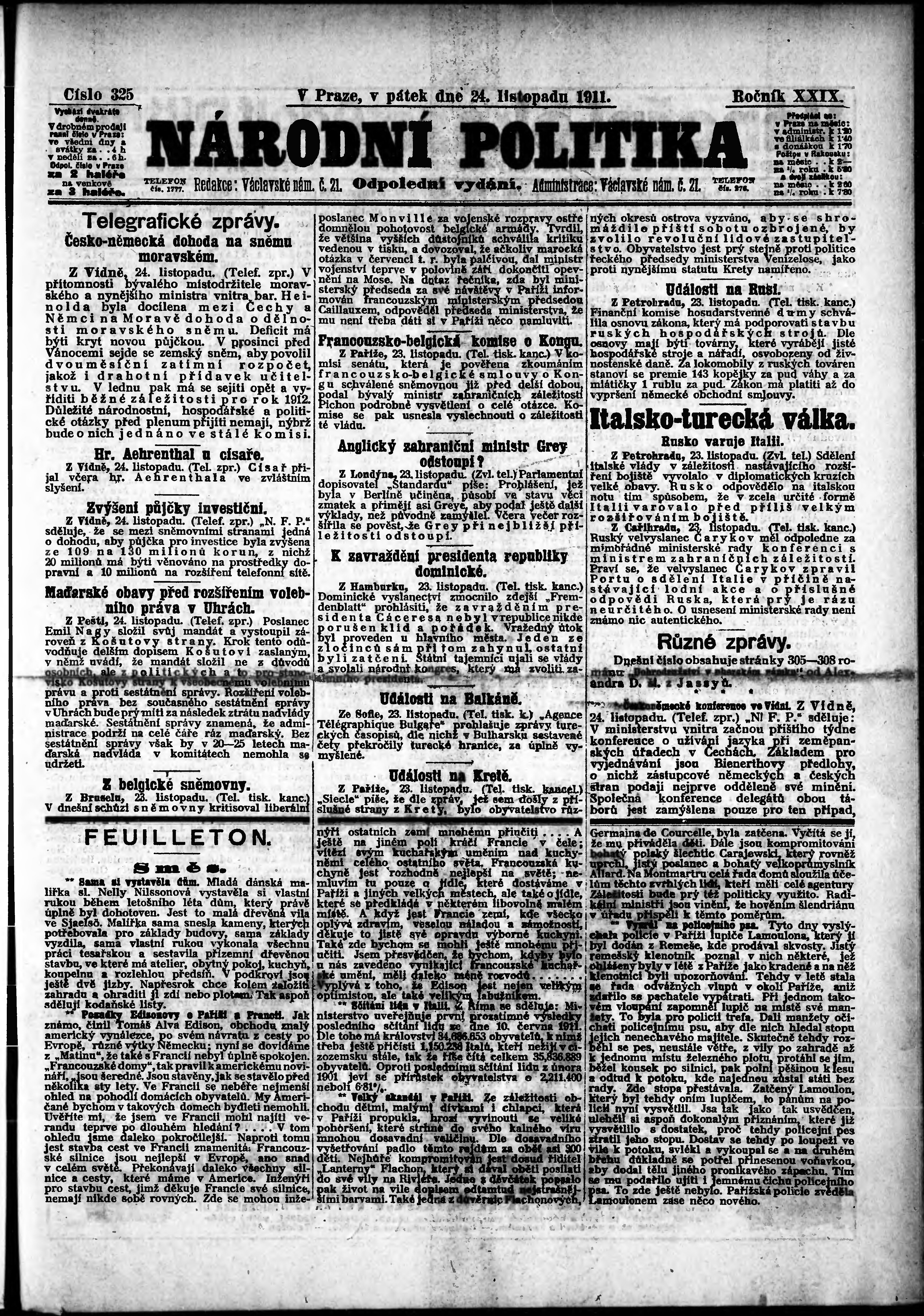 * Datum vydání výtisku: 24.11.1911 Číslo výtisku: 325 Poznámky k výtisku: odpolední vydání;