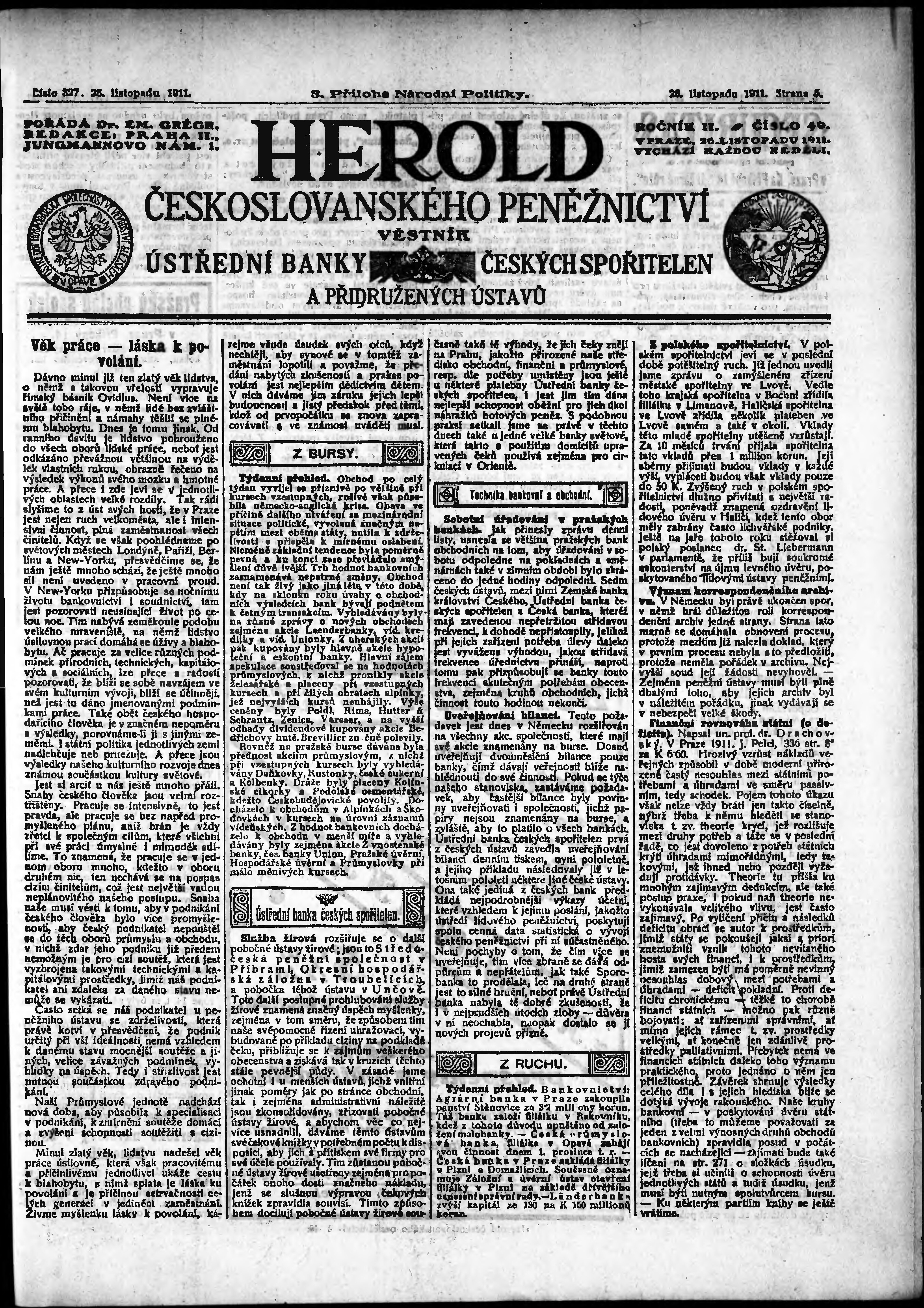 * Datum vydání výtisku: 26.11.1911 Číslo výtisku: 327 Typ výtisku: příloha Poznámky k výtisku: 3. příloha; Obsahuje č. 49 Herold českoslovanského peněžnictví;