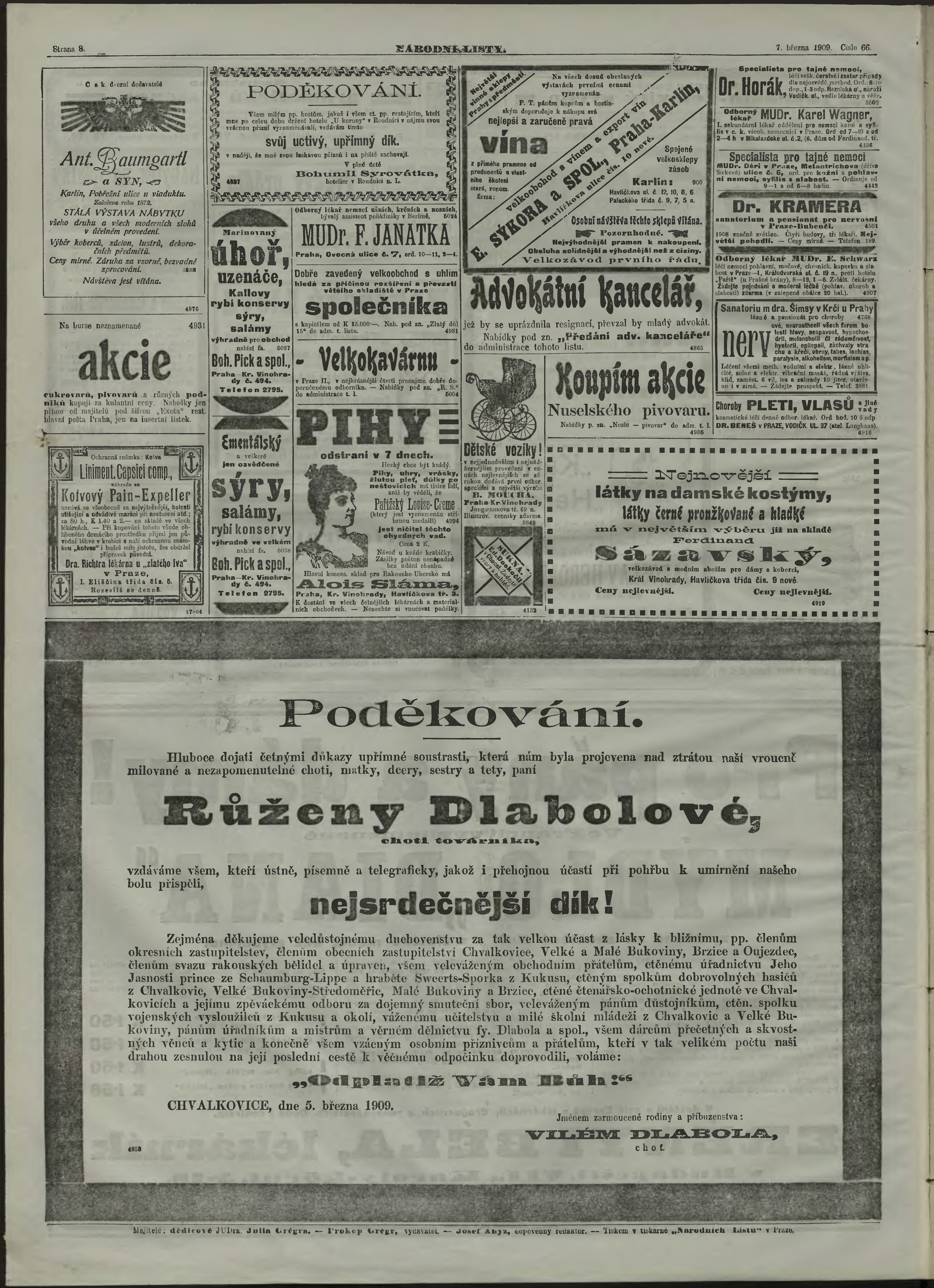 * Datum vydání výtisku: 7.3.1909 Číslo výtisku: 66 Poznámky k výtisku: ranní vydání;