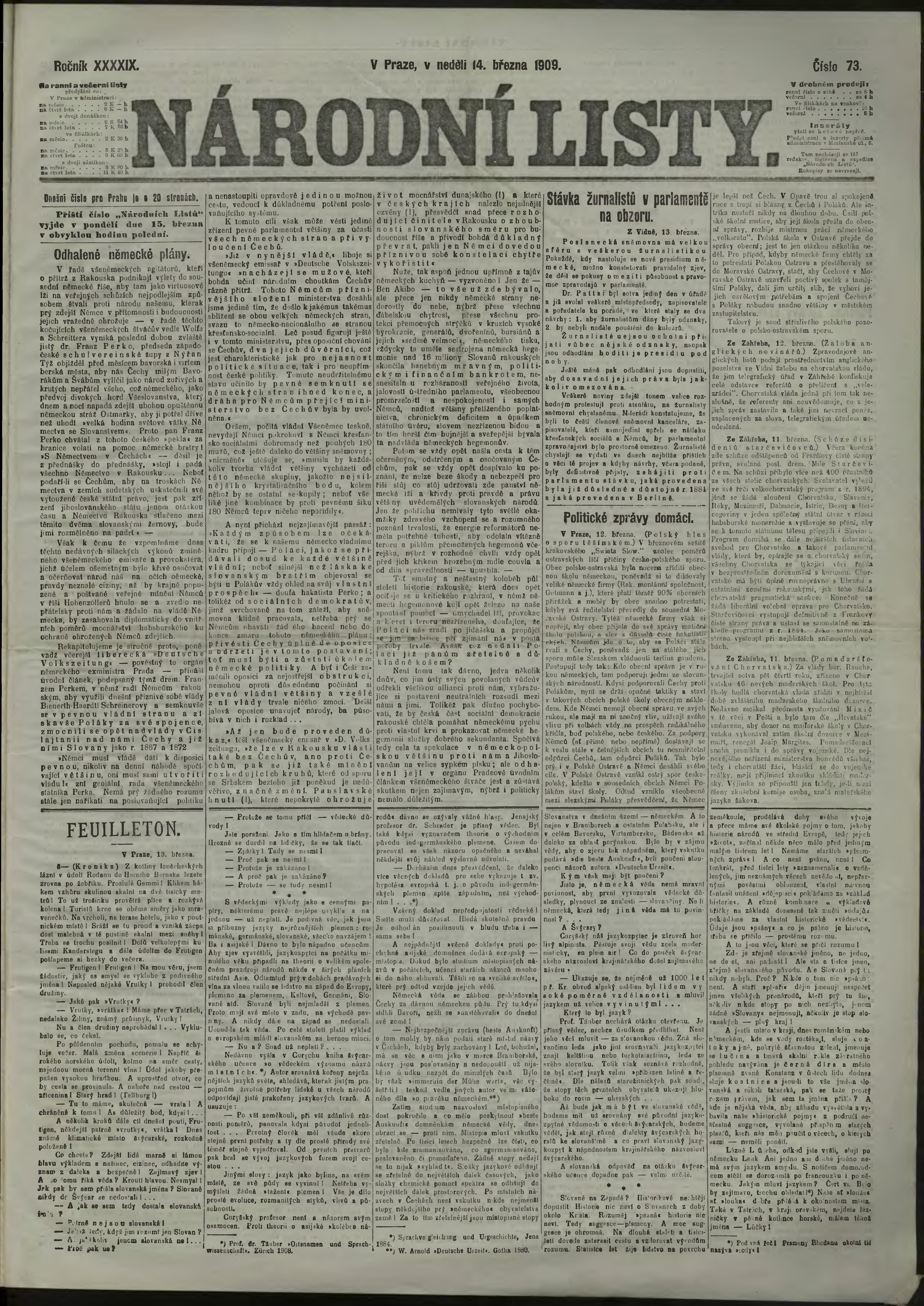 * Datum vydání výtisku: 14.3.1909 Číslo výtisku: 73 Poznámky k výtisku: ranní vydání;