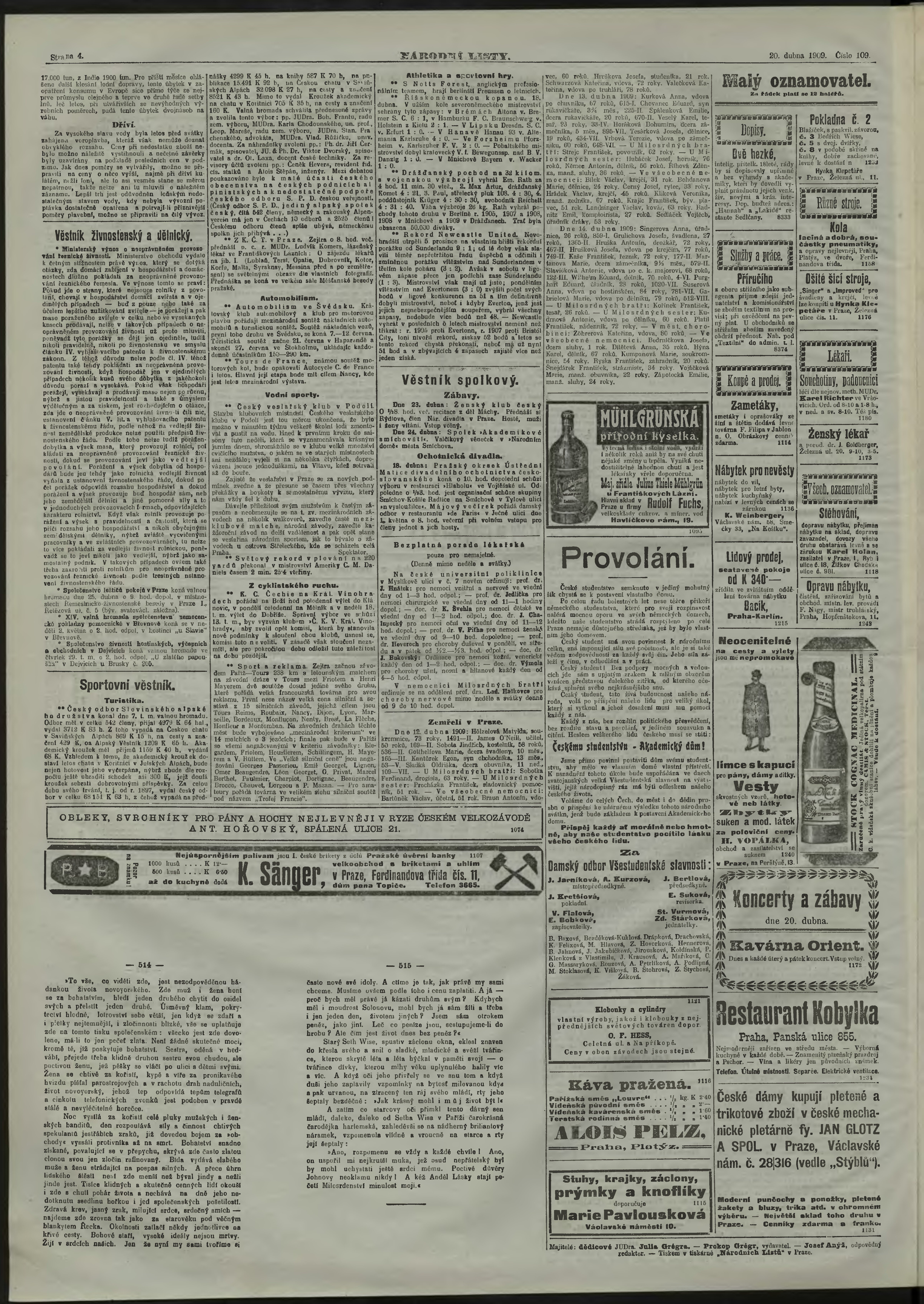 * Datum vydání výtisku: 20.4.1909 Číslo výtisku: 109 Poznámky k výtisku: večerní vydání;