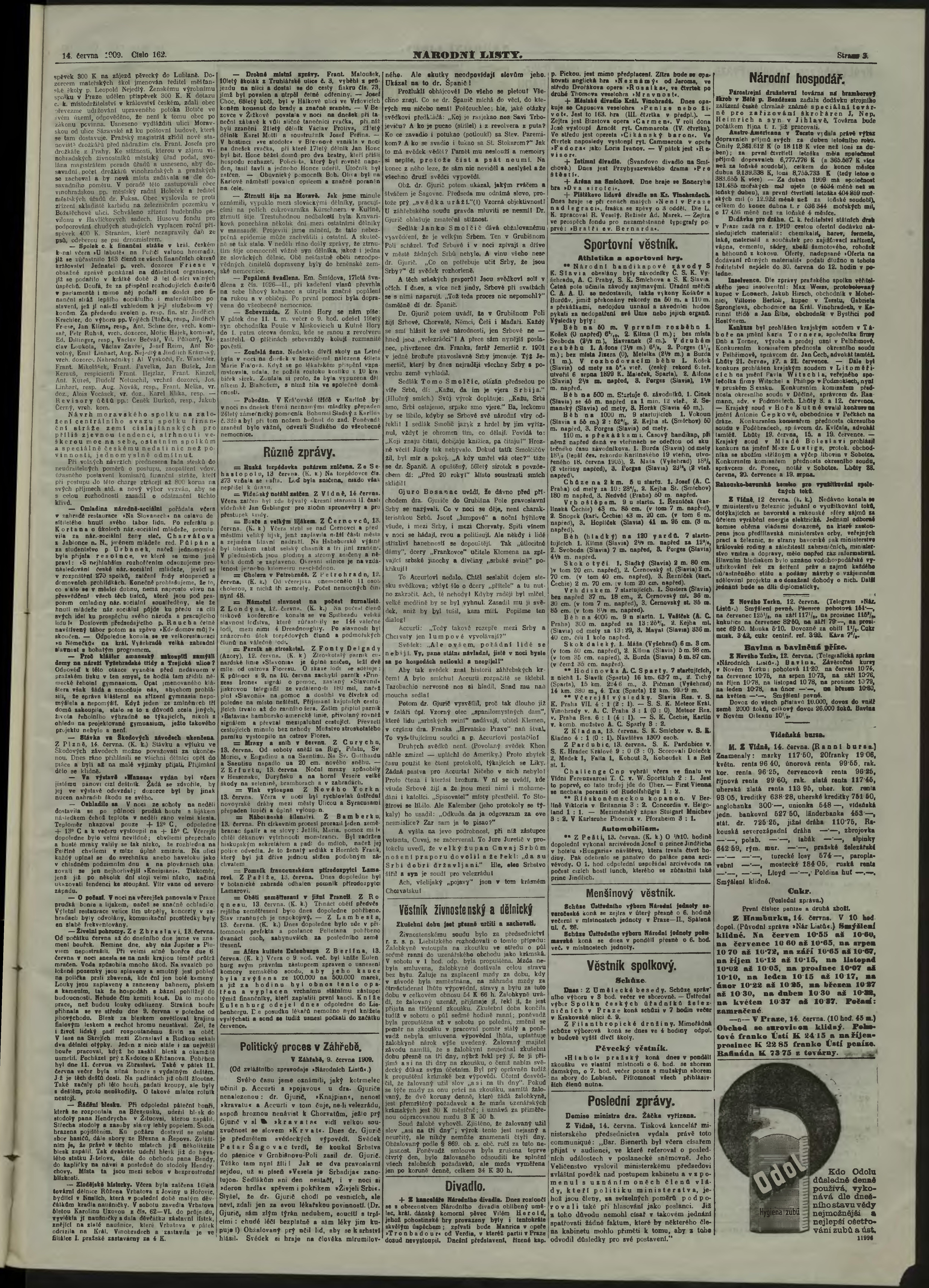 * Datum vydání výtisku: 14.6.1909 Číslo výtisku: 162 Poznámky k výtisku: ranní vydání;