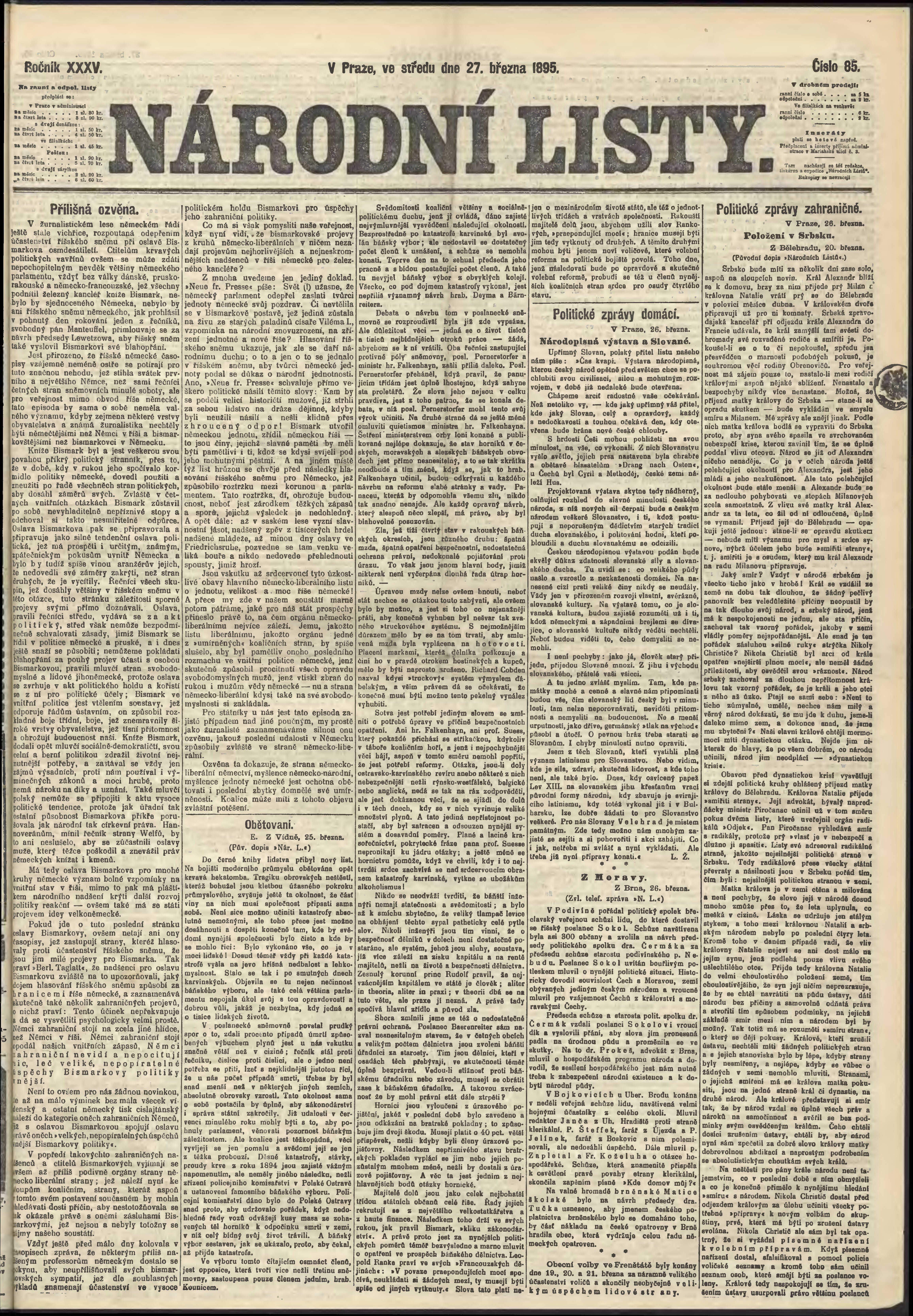 * Datum vydání výtisku: 27.3.1895 Číslo výtisku: 85