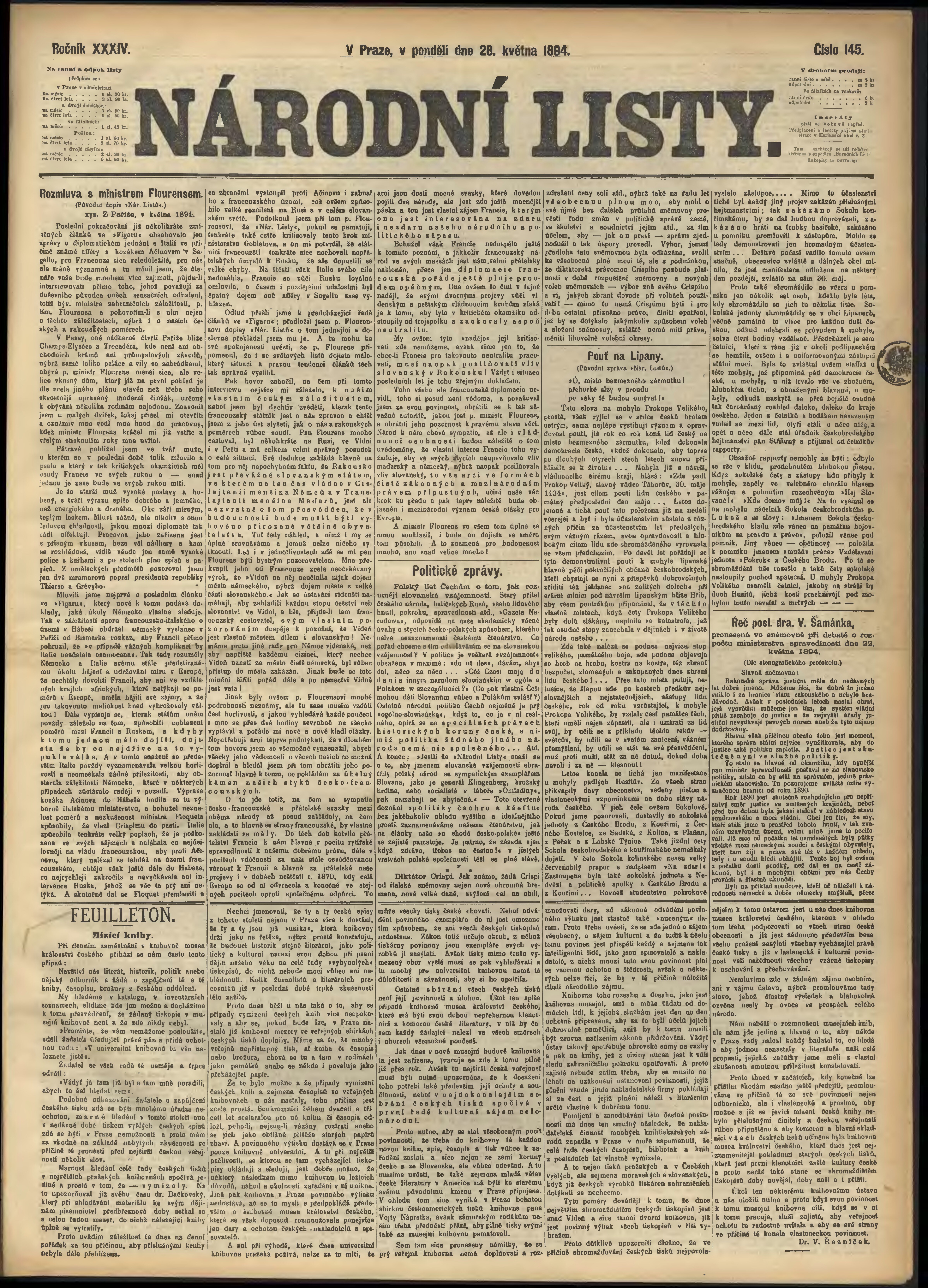 * Datum vydání výtisku: 28.5.1894 Číslo výtisku: 145