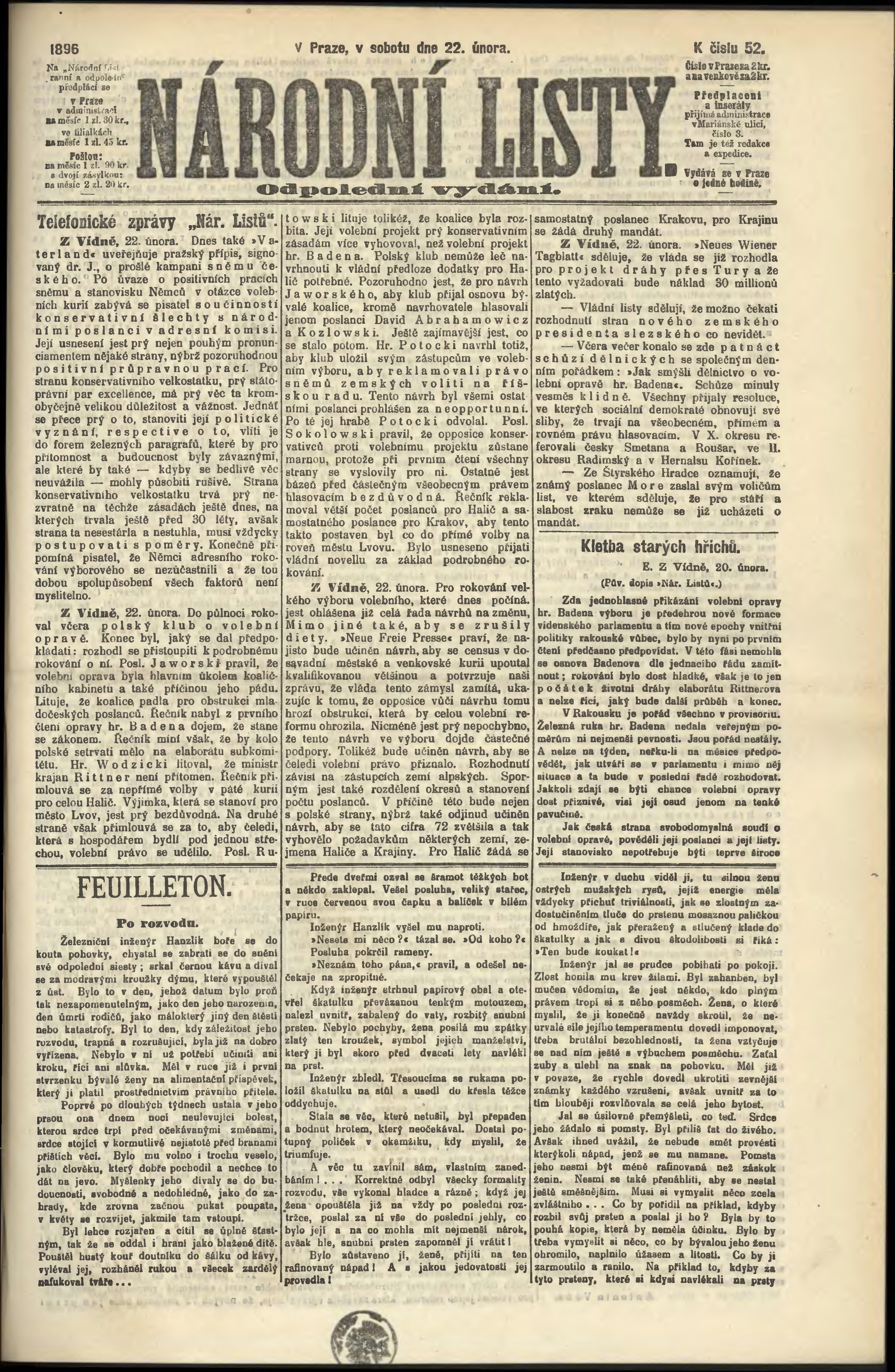 * Datum vydání výtisku: 22.2.1896 Číslo výtisku: 52 Poznámky k výtisku: odpolední vydání;