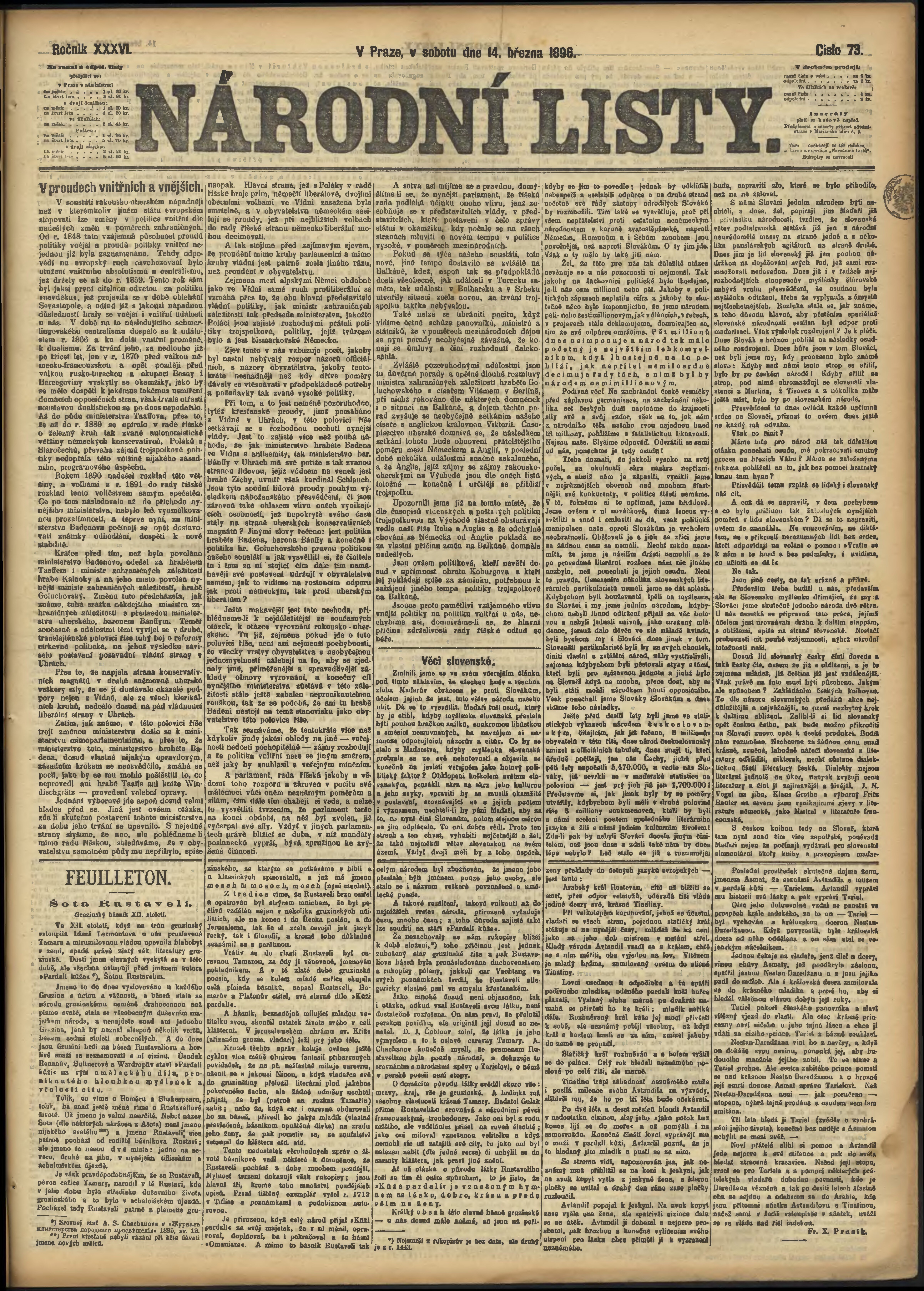 * Datum vydání výtisku: 14.3.1896 Číslo výtisku: 73