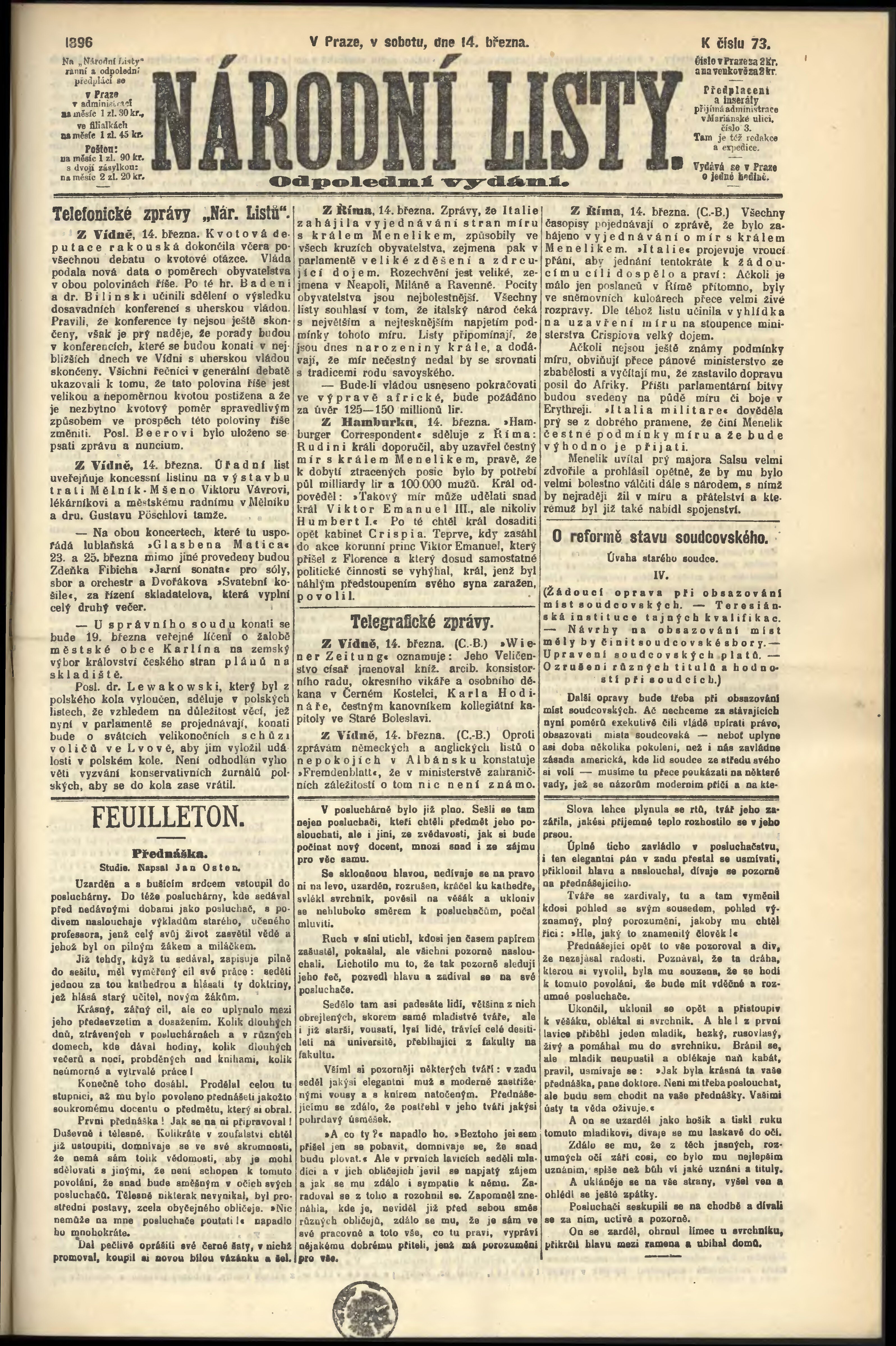* Datum vydání výtisku: 14.3.1896 Číslo výtisku: 73 Poznámky k výtisku: odpolední vydání;