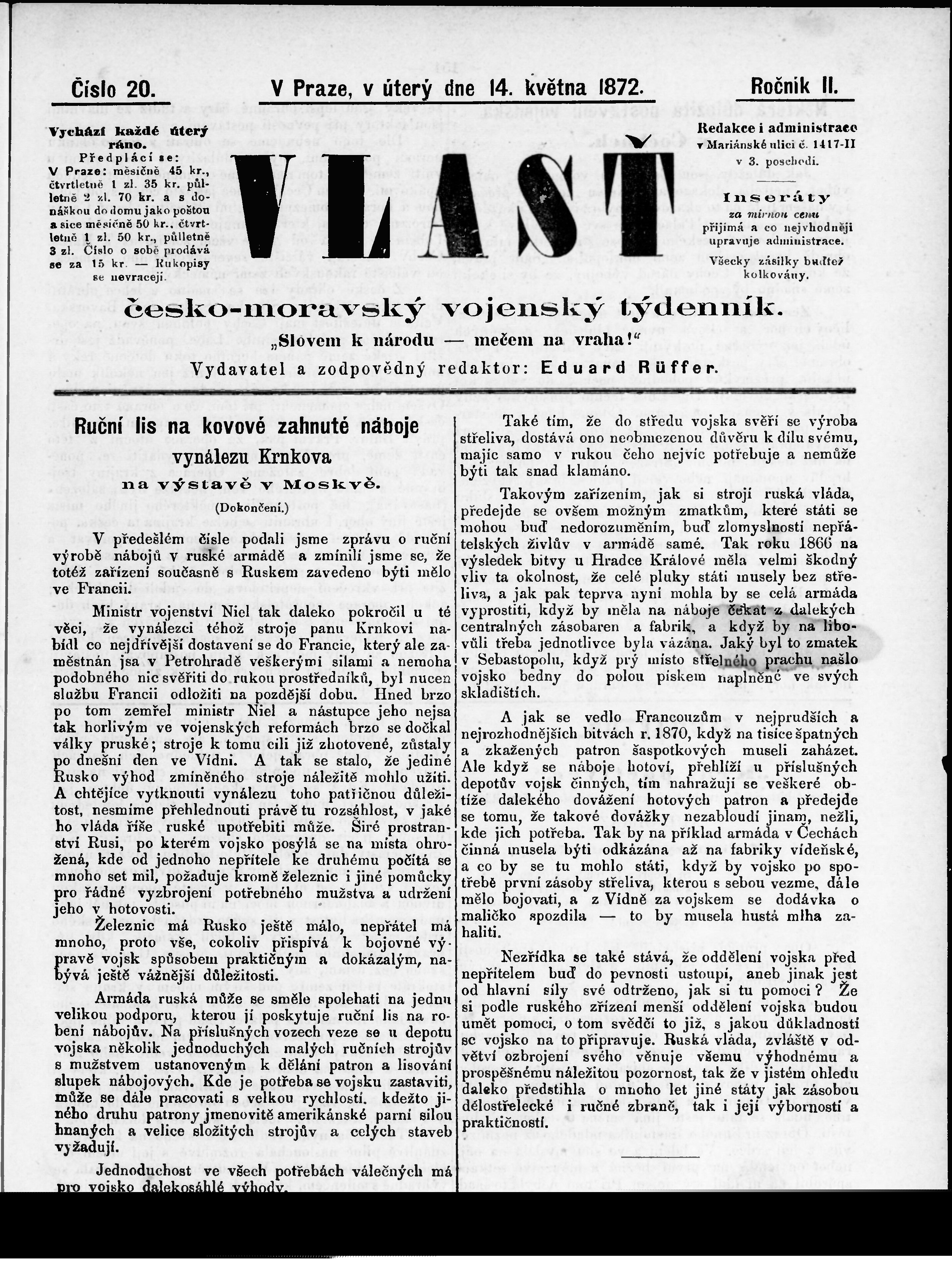* Datum vydání výtisku: 14.5.1872 Číslo výtisku: 20