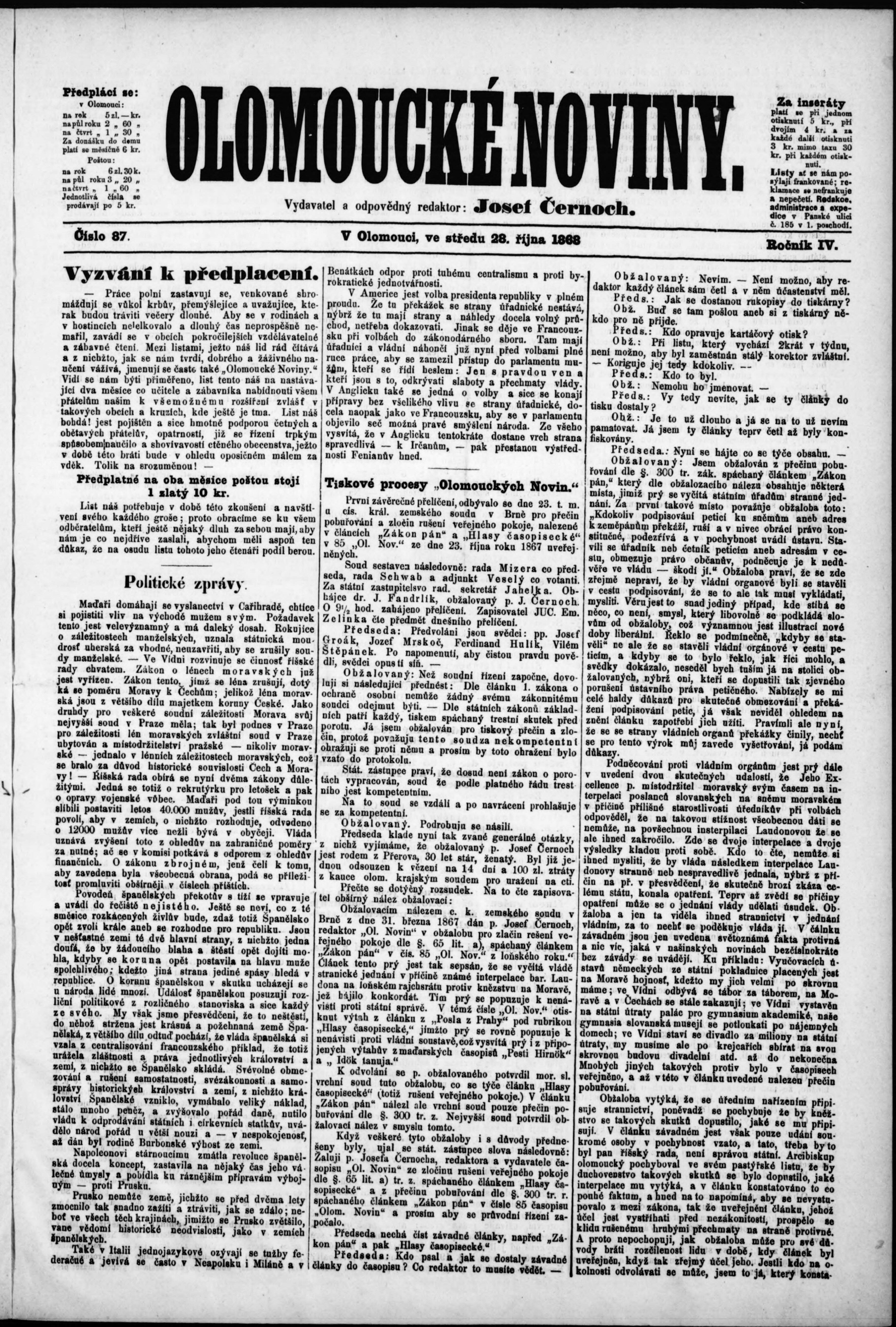 * Datum vydání výtisku: 28.10.1868 Číslo výtisku: 87