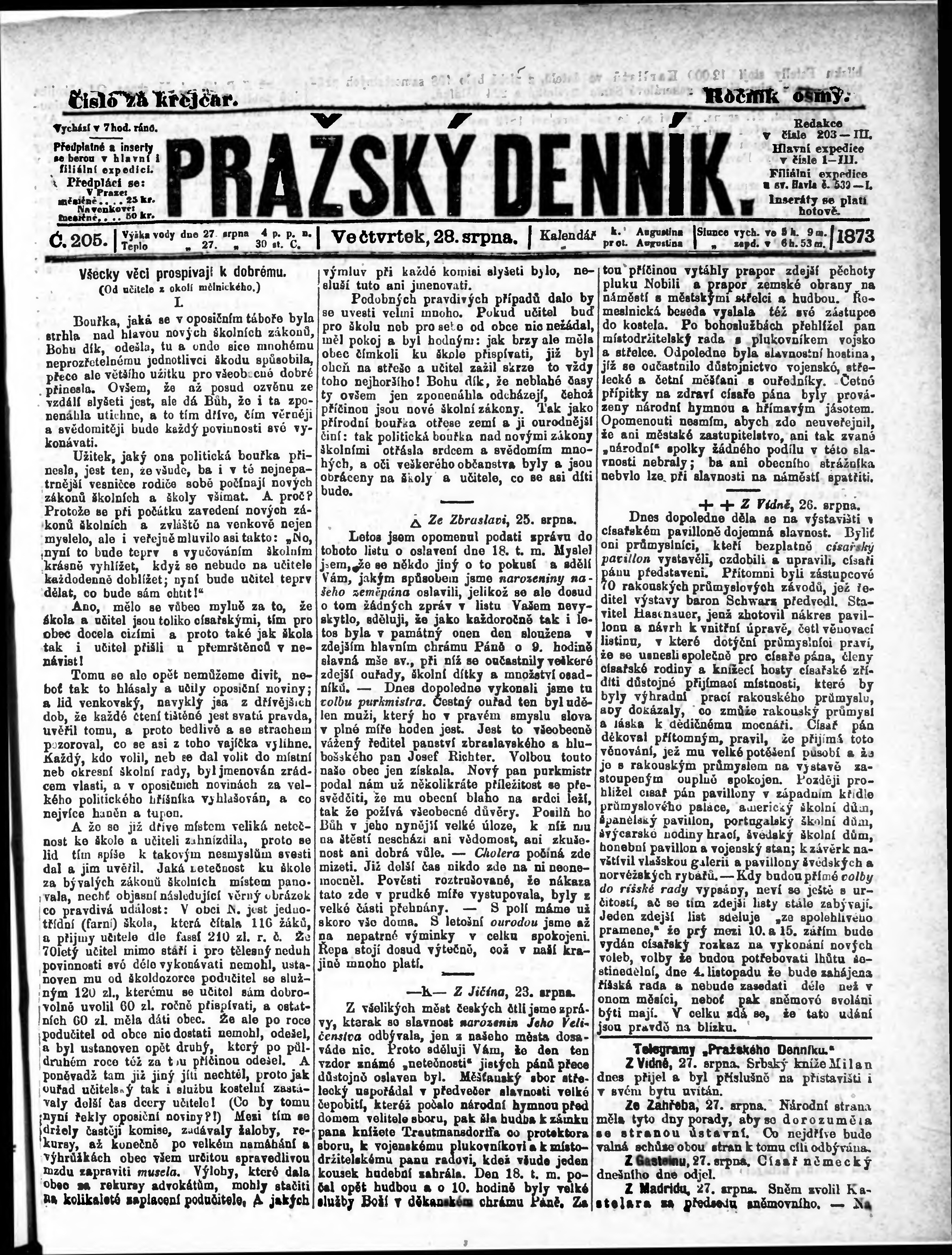 * Datum vydání výtisku: 28.8.1873 Číslo výtisku: 205
