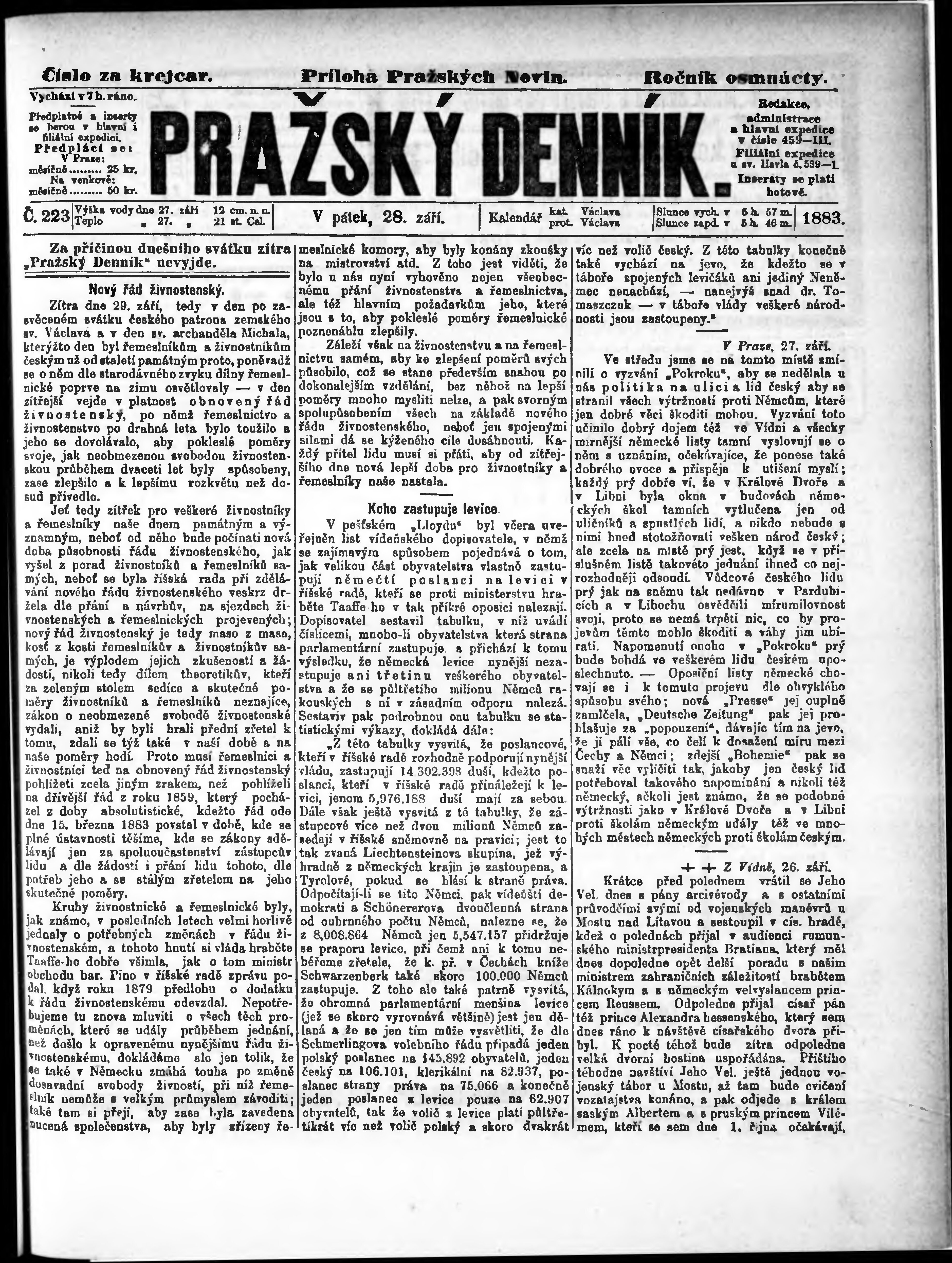 * Datum vydání výtisku: 28.9.1883 Číslo výtisku: 223