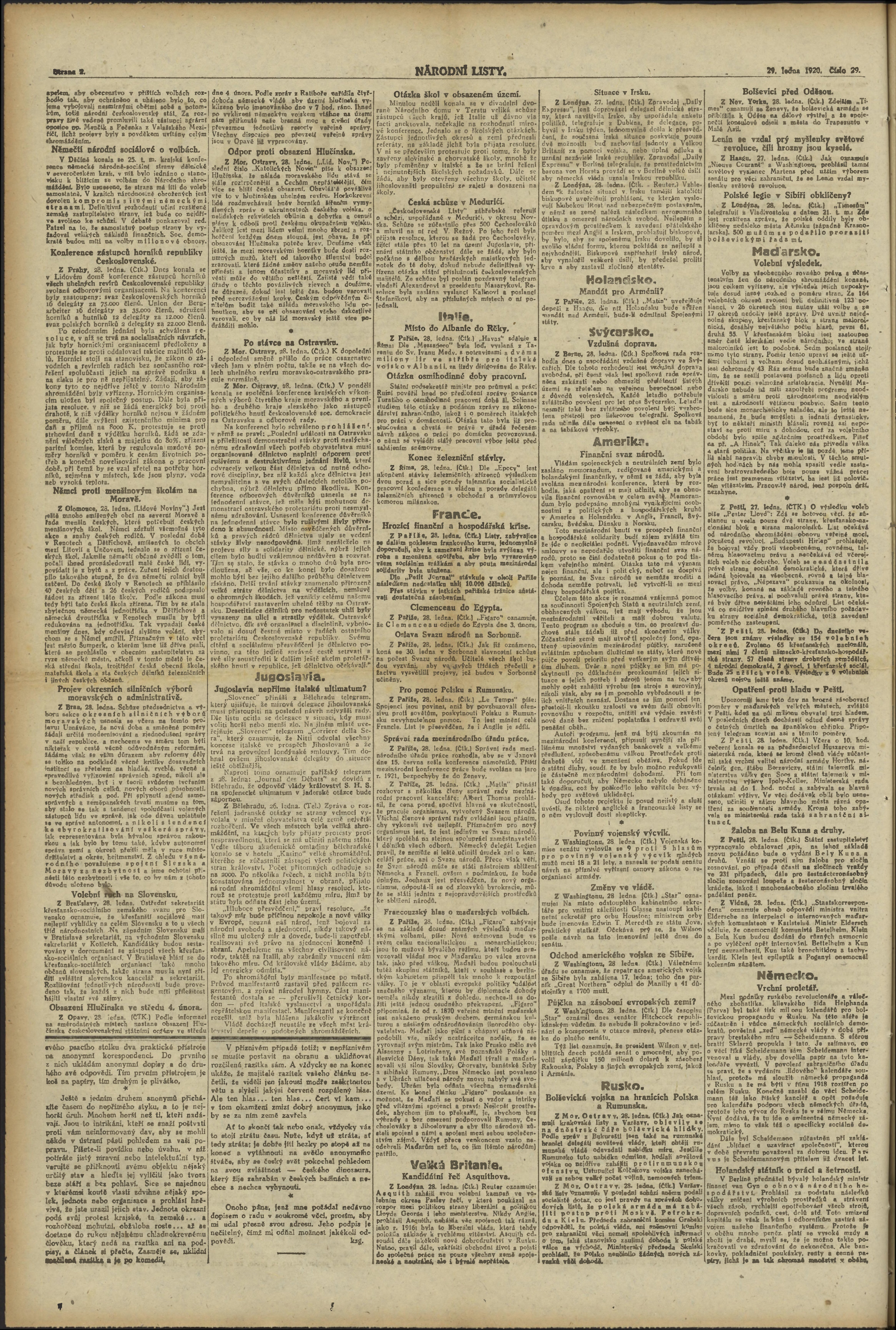 * Datum vydání výtisku: 29.1.1920 Číslo výtisku: 29 Poznámky k výtisku: ranní vydání;
