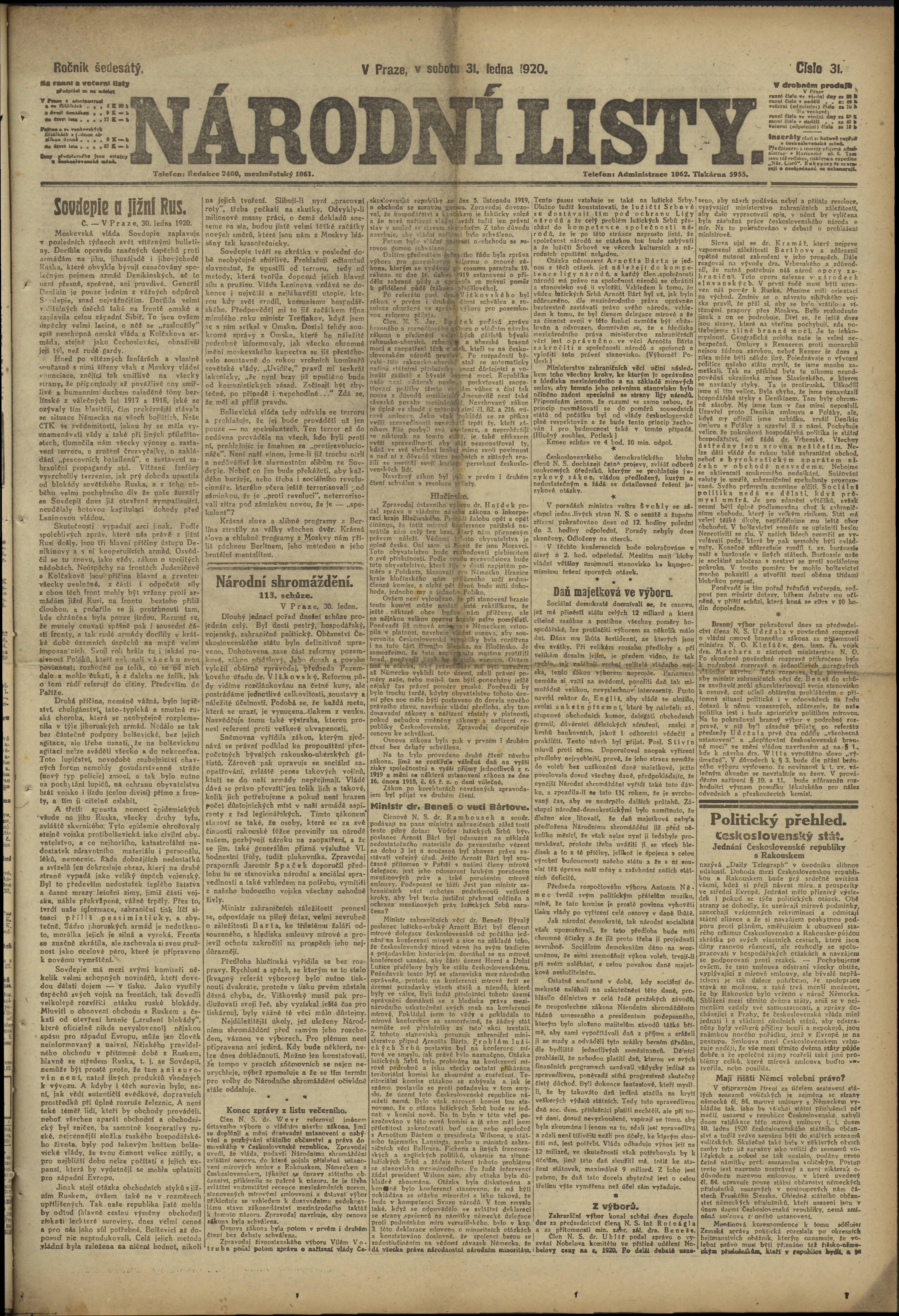 * Datum vydání výtisku: 31.1.1920 Číslo výtisku: 31 Poznámky k výtisku: ranní vydání;