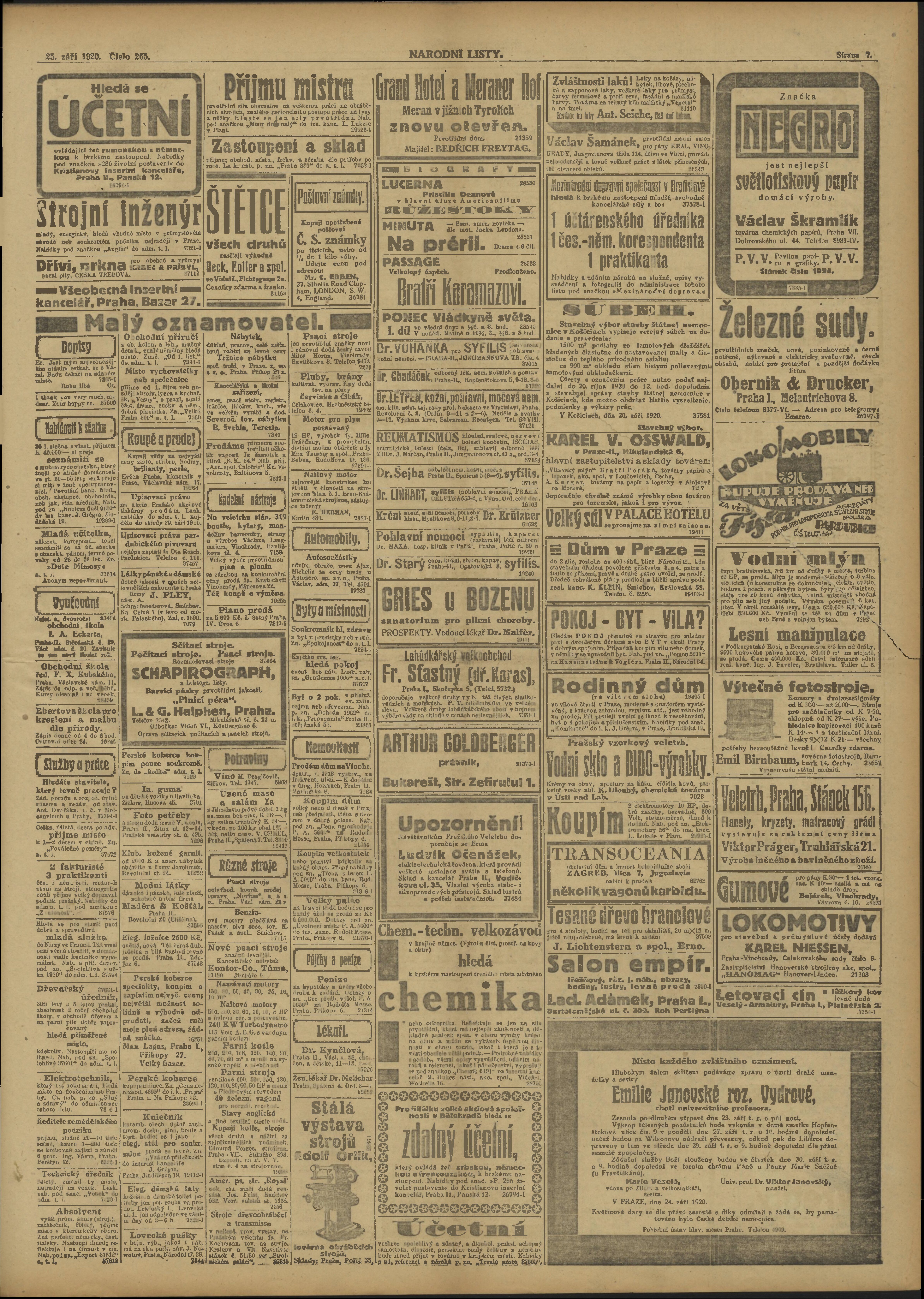 * Datum vydání výtisku: 25.9.1920 Číslo výtisku: 265 Poznámky k výtisku: ranní vydání;