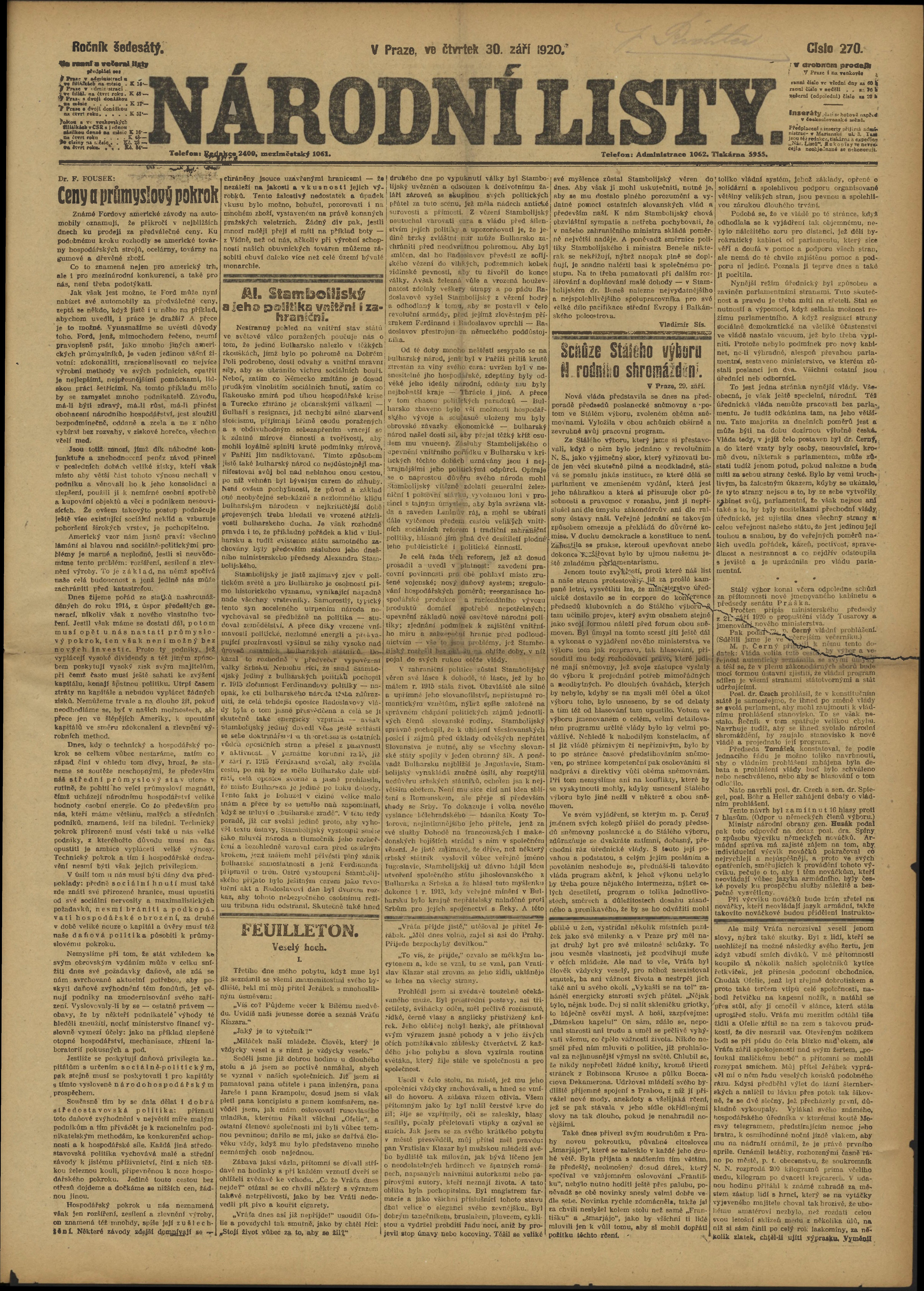 * Datum vydání výtisku: 30.9.1920 Číslo výtisku: 270 Poznámky k výtisku: ranní vydání;