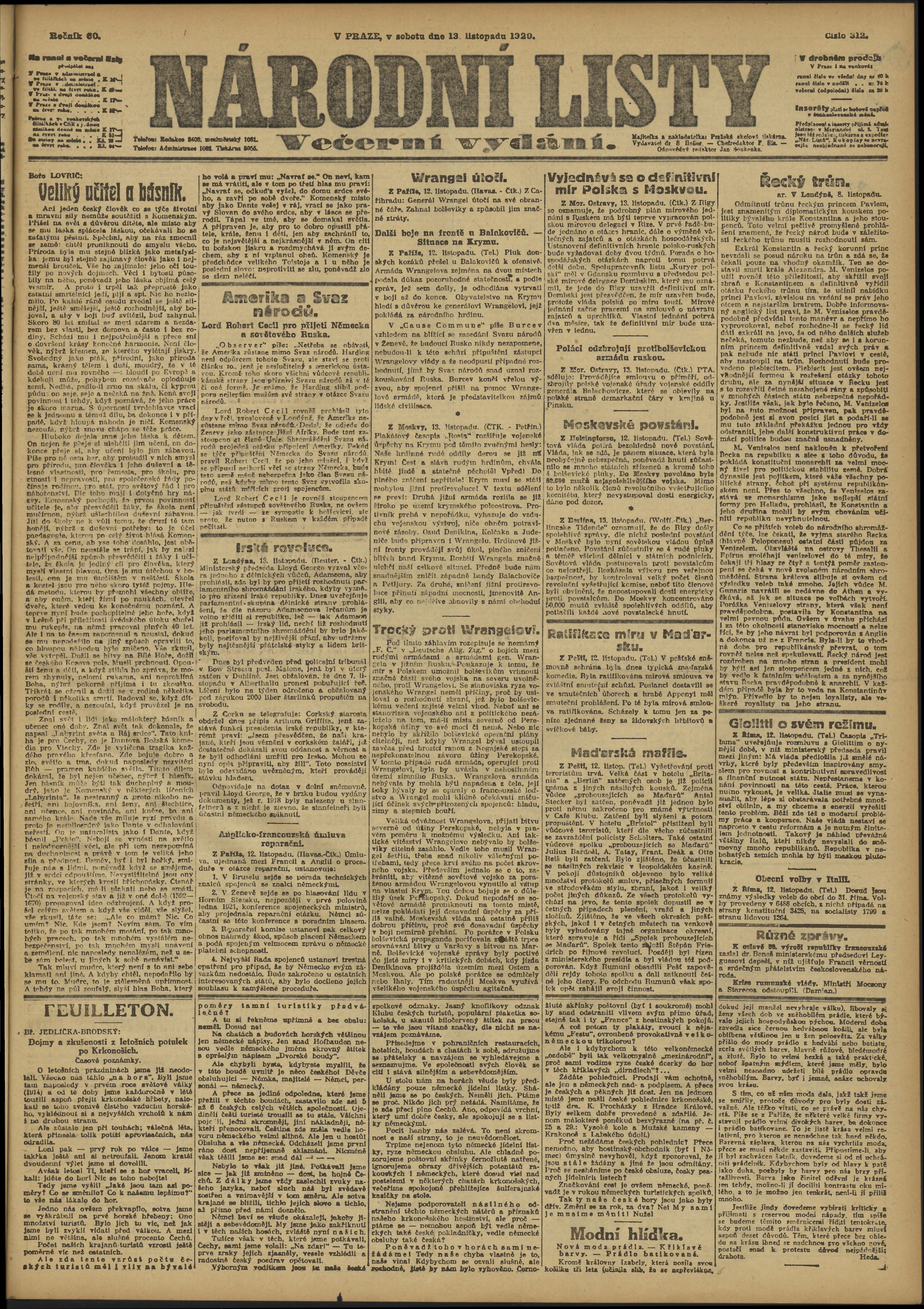 * Datum vydání výtisku: 13.11.1920 Číslo výtisku: 312 Poznámky k výtisku: večerní vydání;