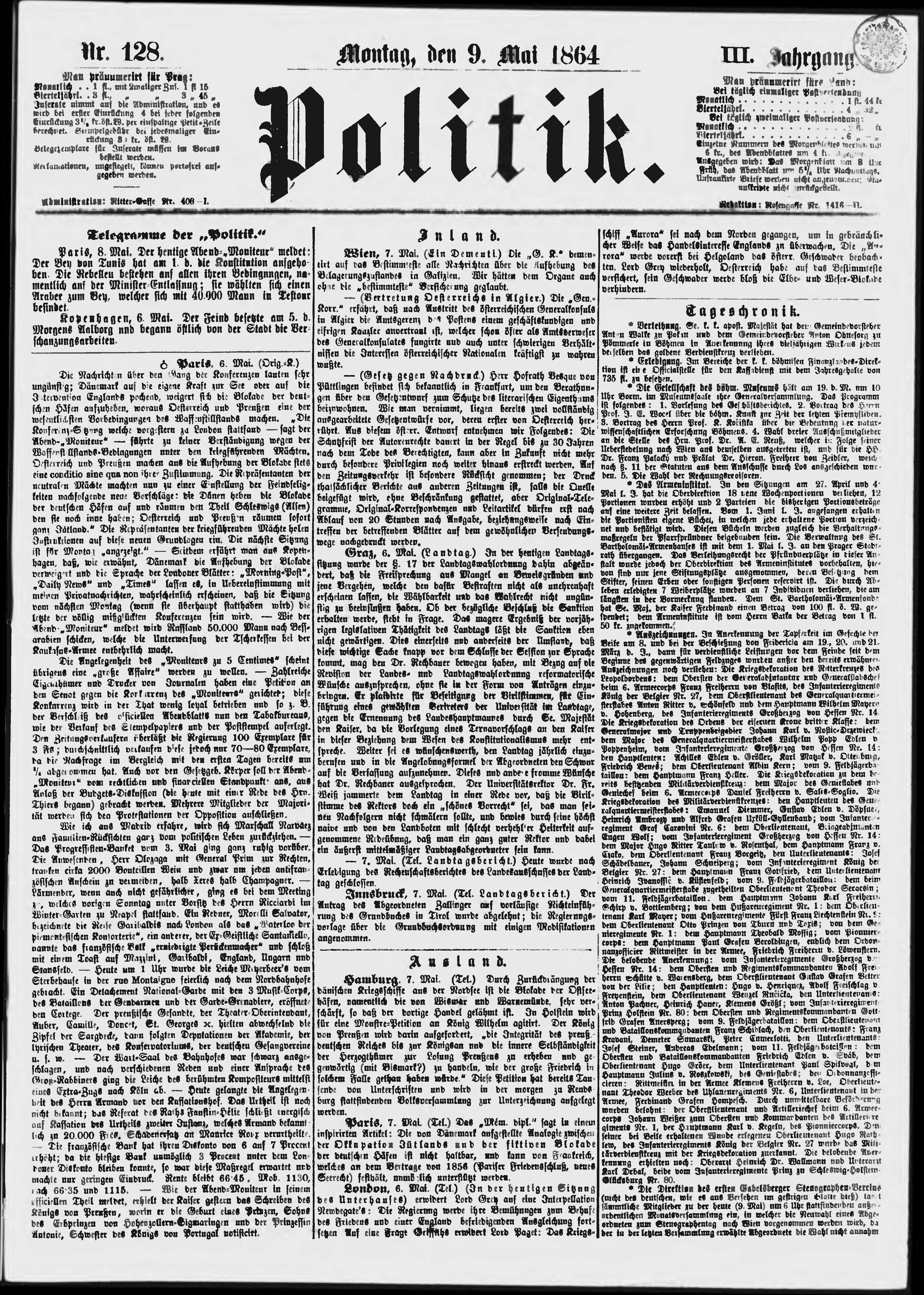 * Datum vydání výtisku: 9.5.1864 Číslo výtisku: 128