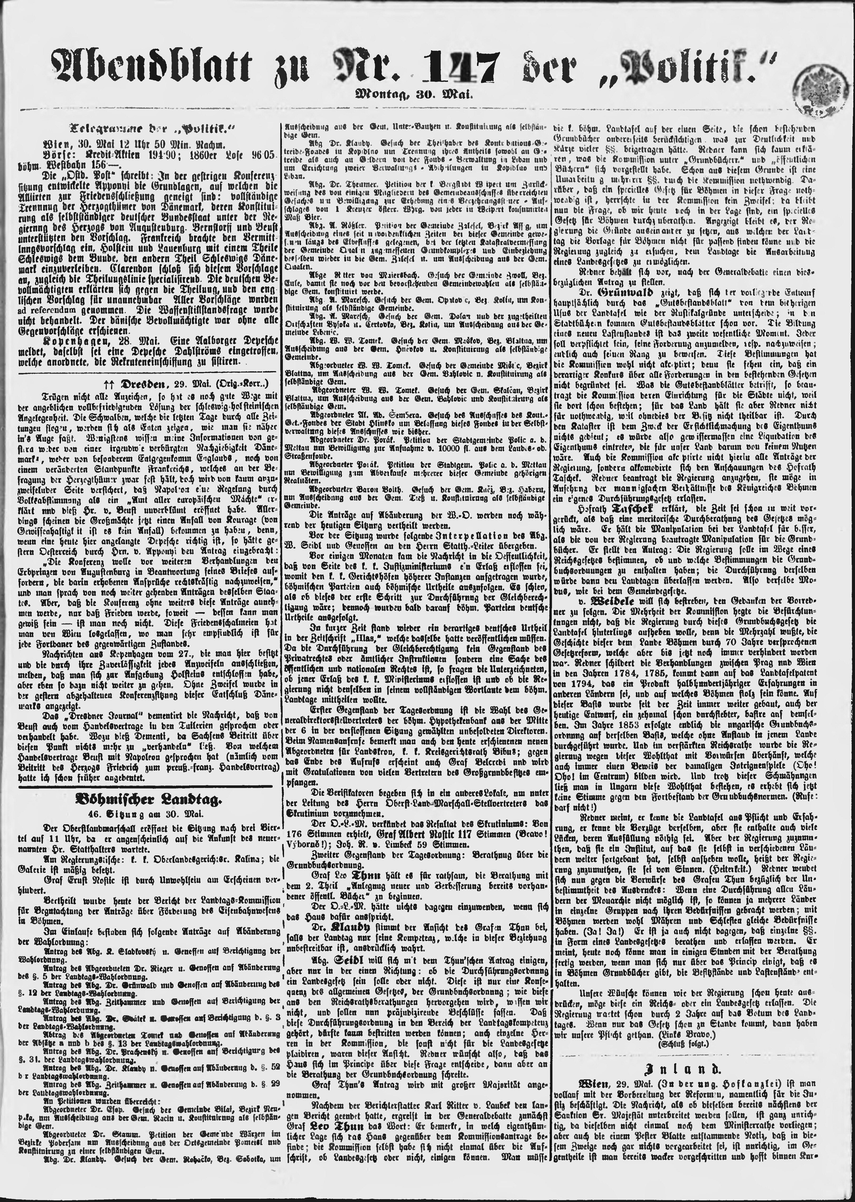 * Datum vydání výtisku: 30.5.1864 Číslo výtisku: 147 Poznámky k výtisku: večerní vydání;