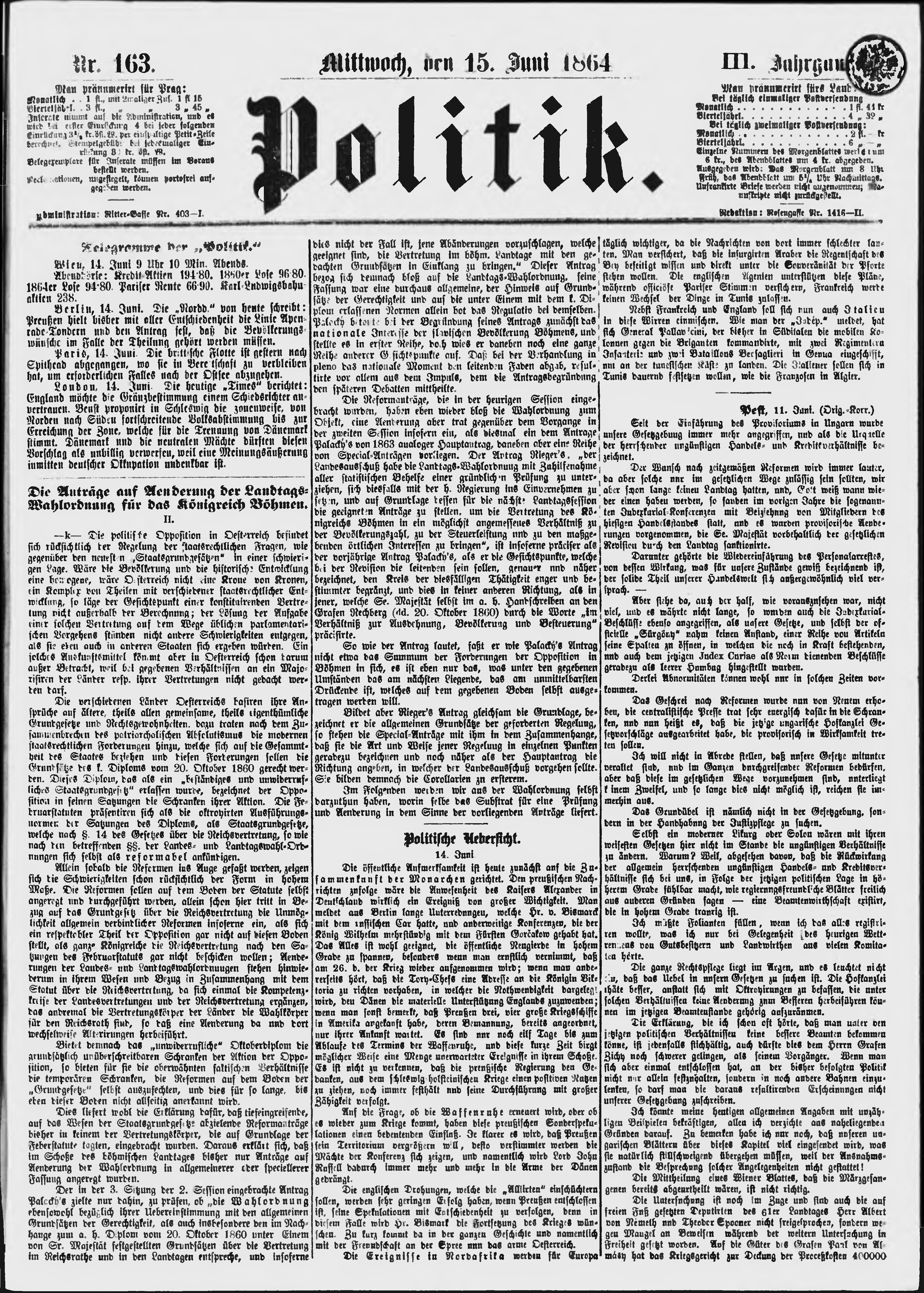 * Datum vydání výtisku: 15.6.1864 Číslo výtisku: 163