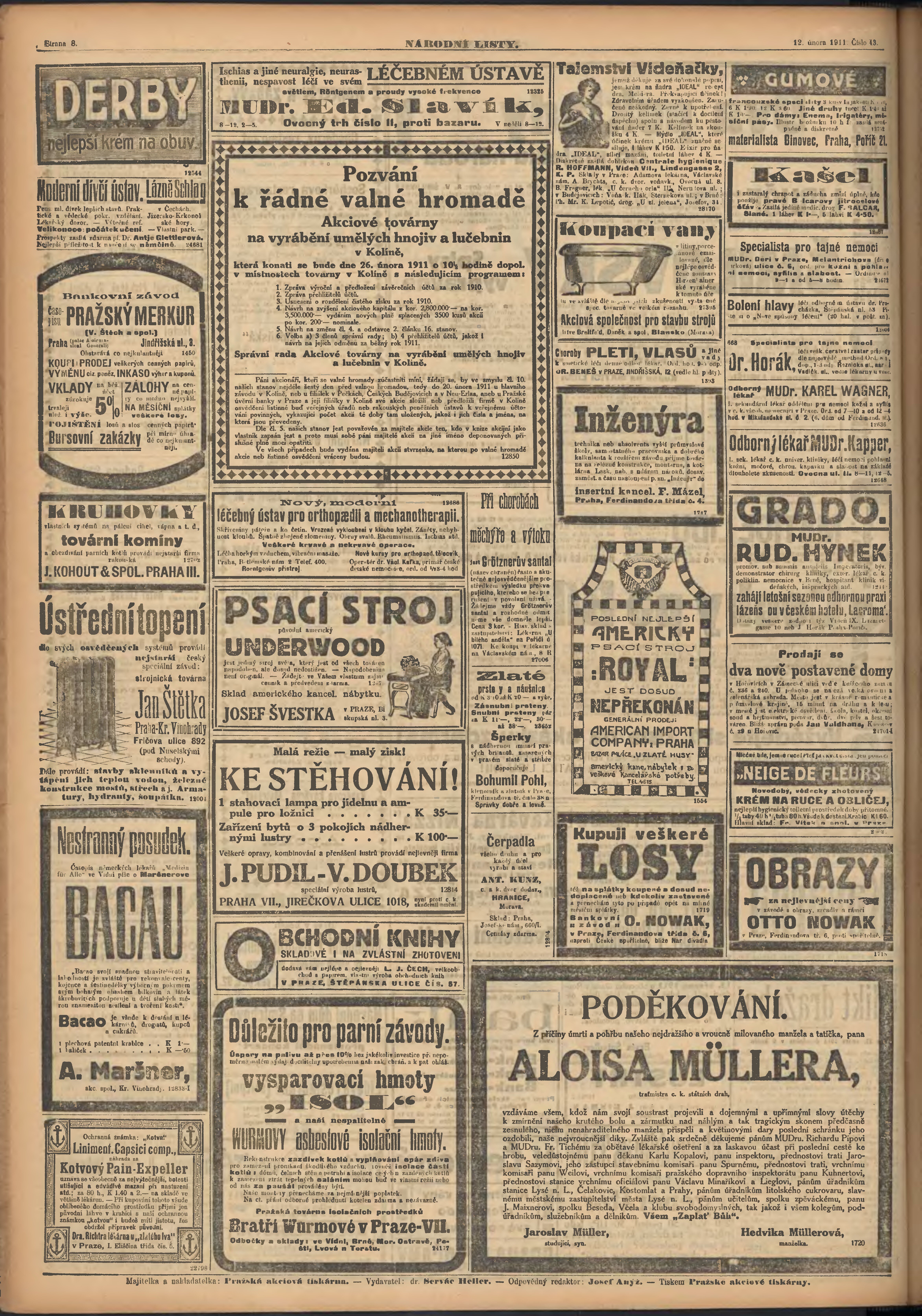 * Datum vydání výtisku: 12.2.1911 Číslo výtisku: 43 Poznámky k výtisku: ranní vydání;