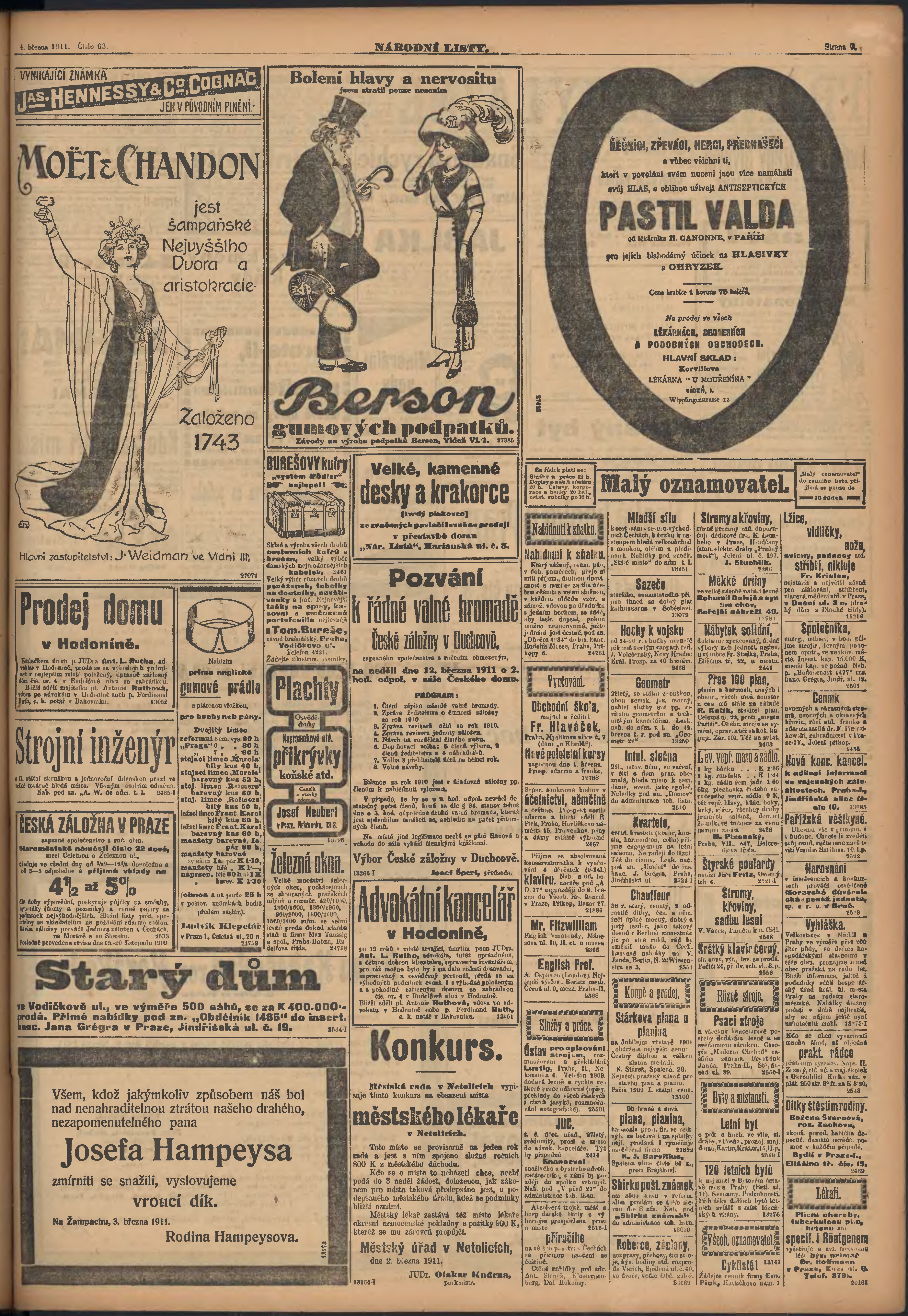 * Datum vydání výtisku: 4.3.1911 Číslo výtisku: 63 Poznámky k výtisku: ranní vydání;