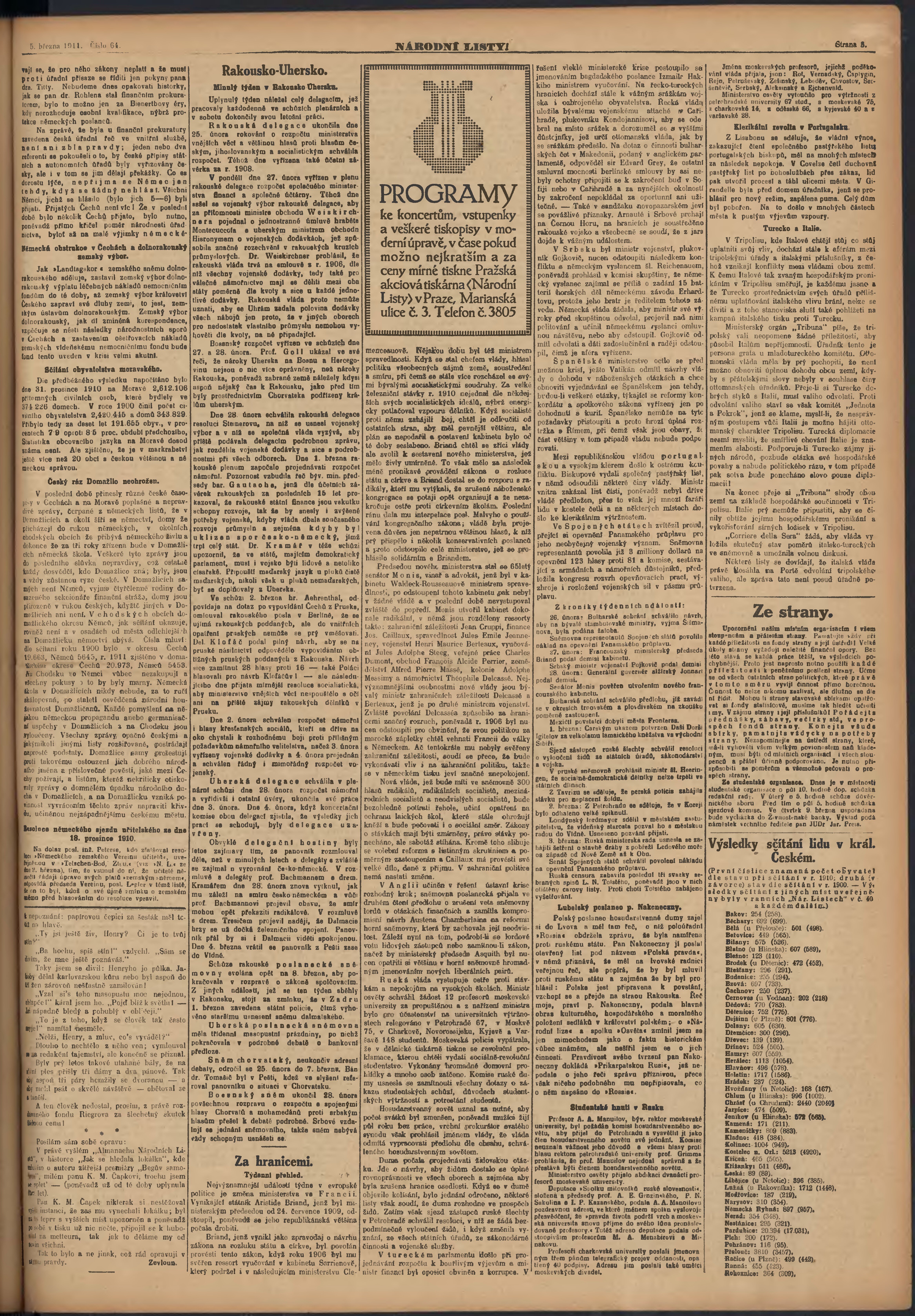 * Datum vydání výtisku: 5.3.1911 Číslo výtisku: 64 Poznámky k výtisku: ranní vydání;
