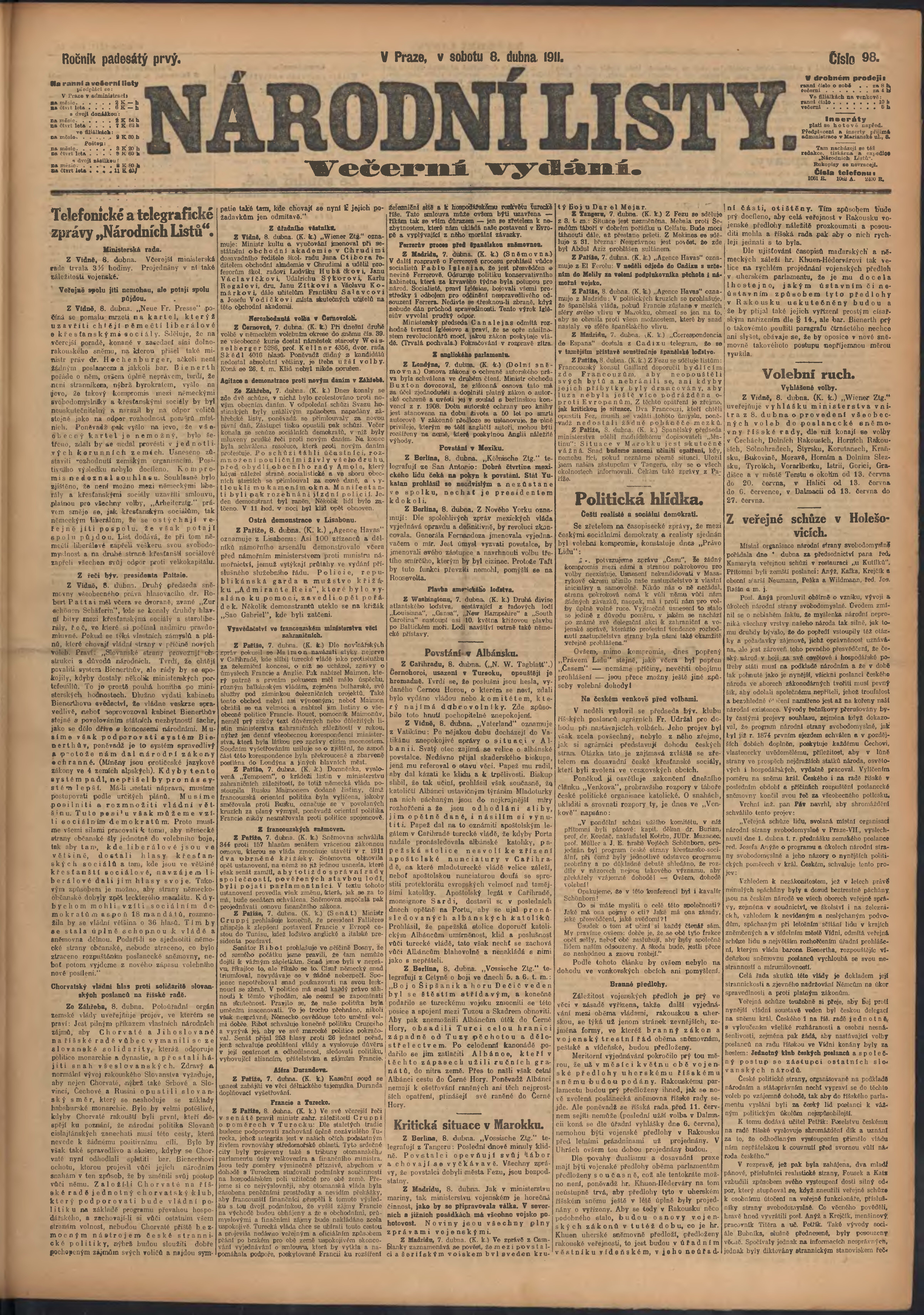 * Datum vydání výtisku: 8.4.1911 Číslo výtisku: 98 Poznámky k výtisku: večerní vydání;