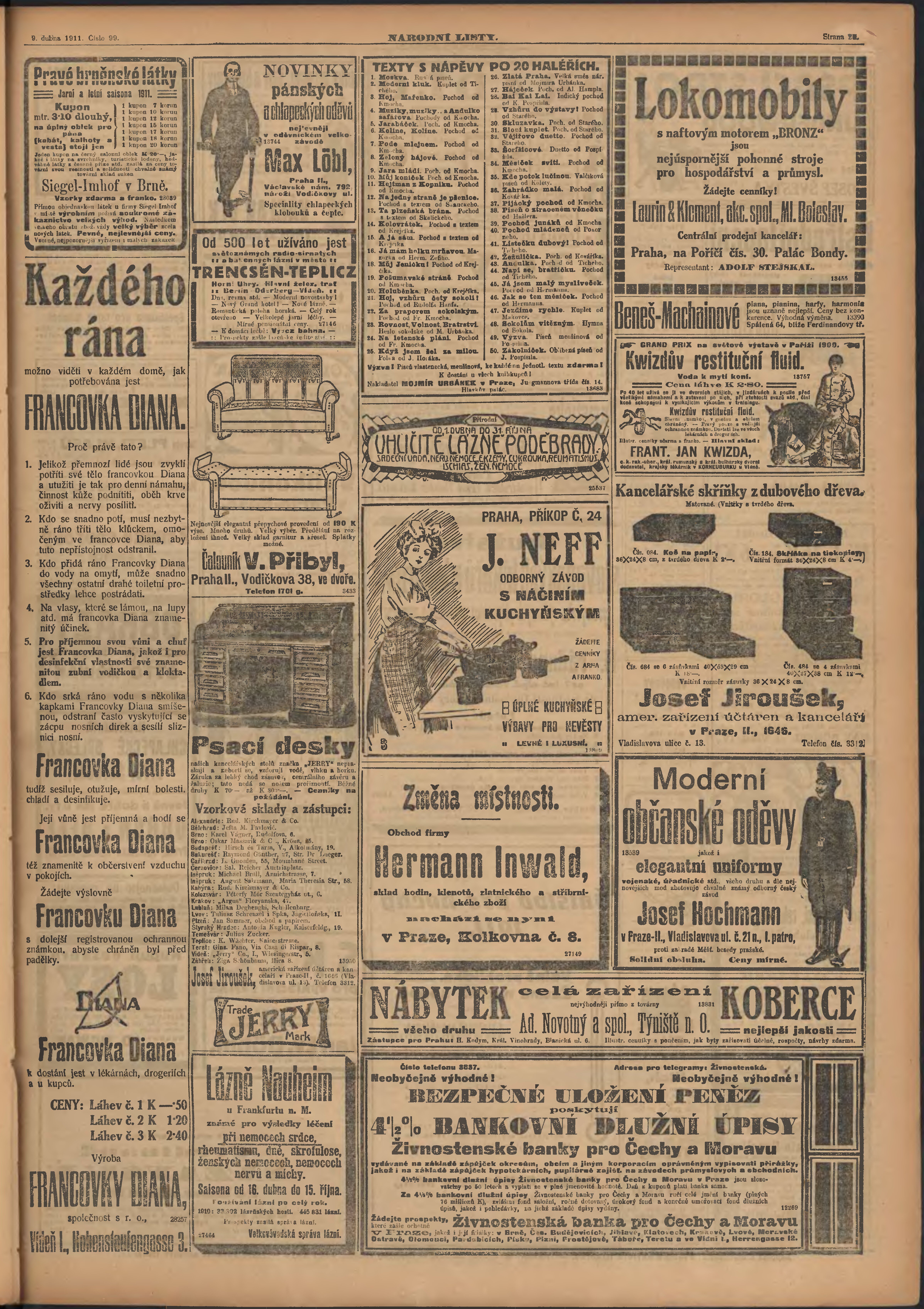 * Datum vydání výtisku: 9.4.1911 Číslo výtisku: 99 Poznámky k výtisku: ranní vydání;