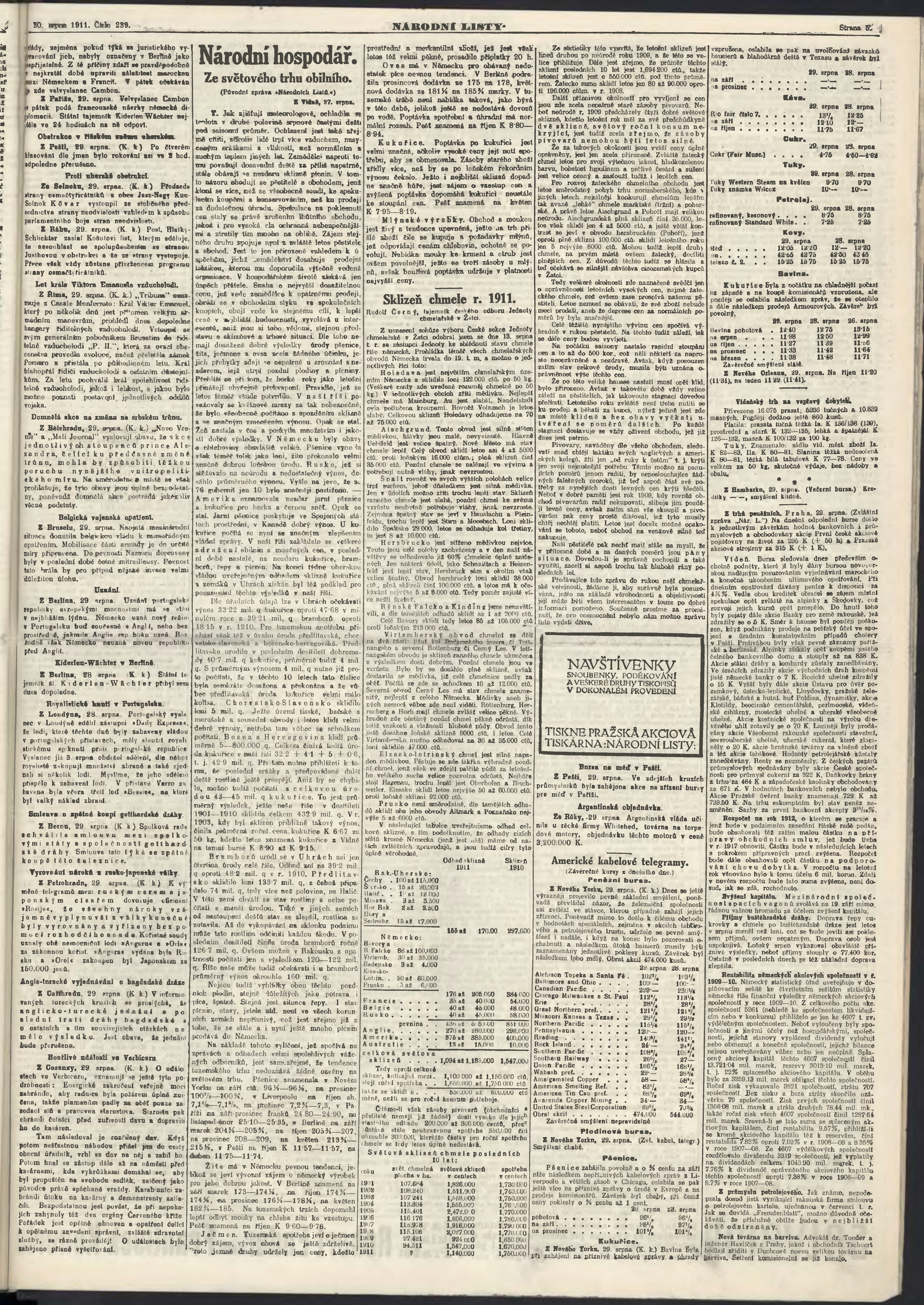 * Datum vydání výtisku: 30.8.1911 Číslo výtisku: 239 Poznámky k výtisku: ranní vydání;