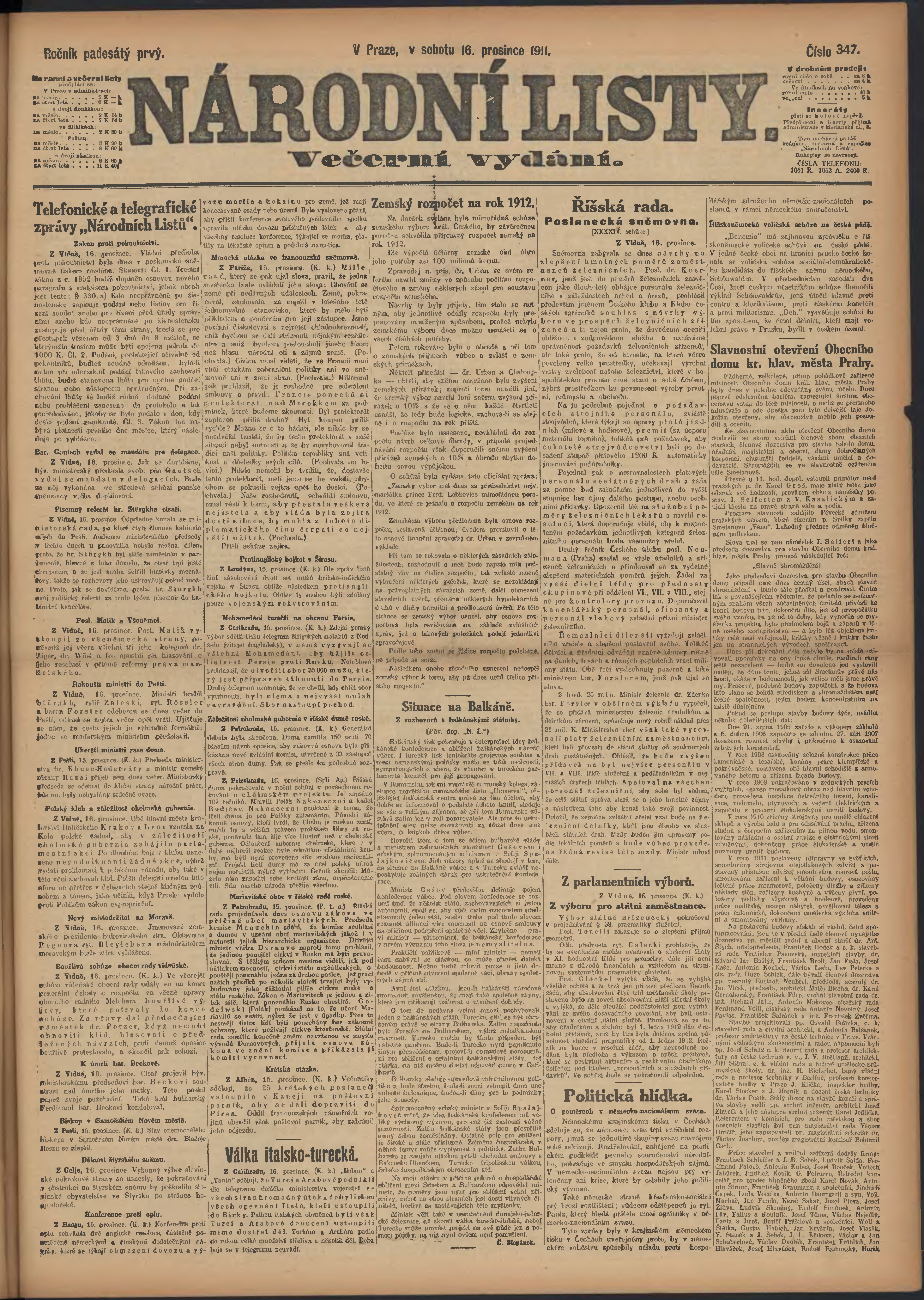 * Datum vydání výtisku: 16.12.1911 Číslo výtisku: 347 Poznámky k výtisku: večerní vydání;